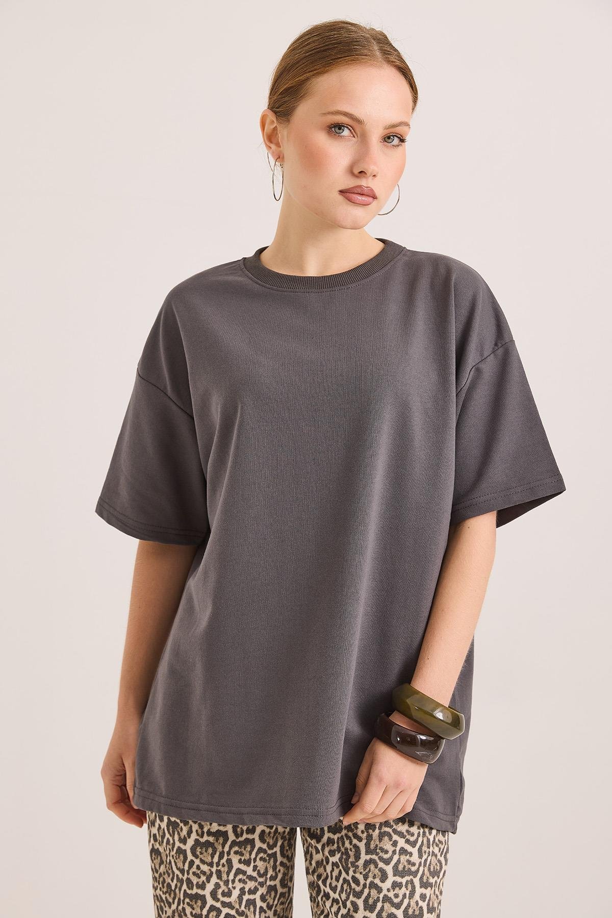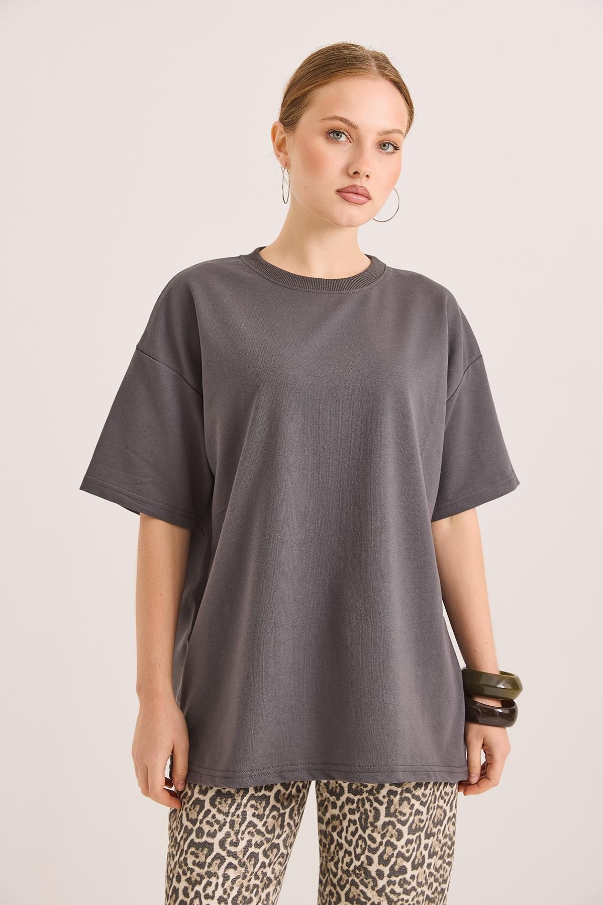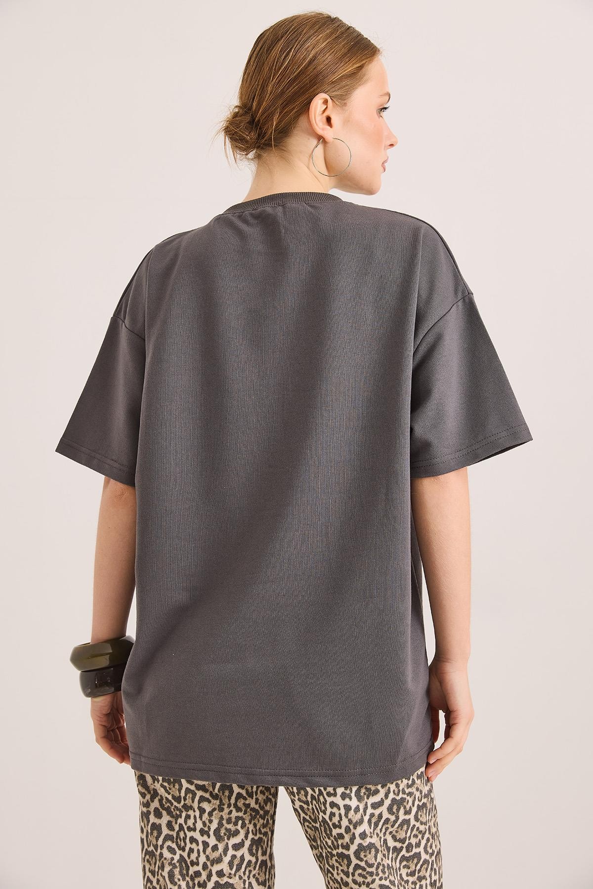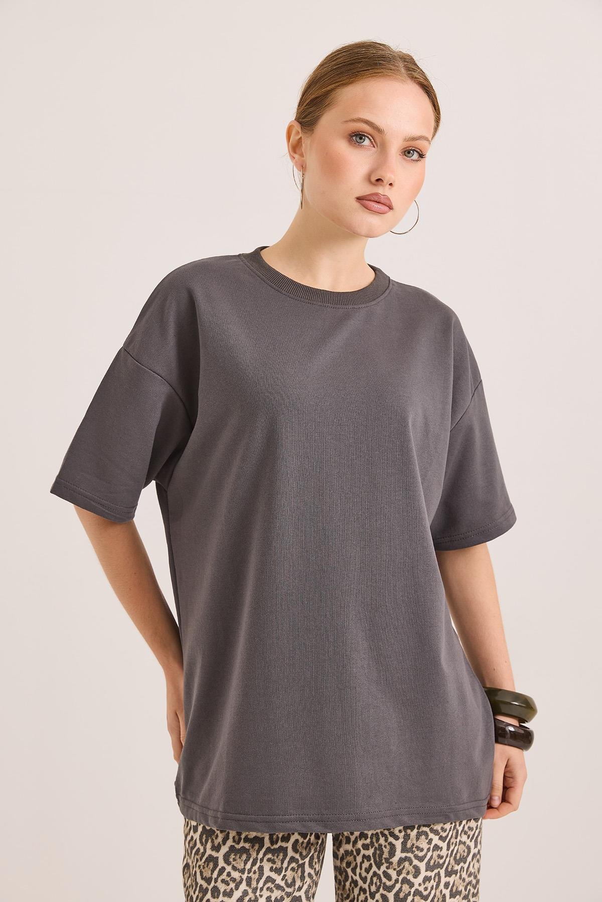 Oversize Bisiklet Yaka Basic Tshirt Füme (250561TSHXFME)