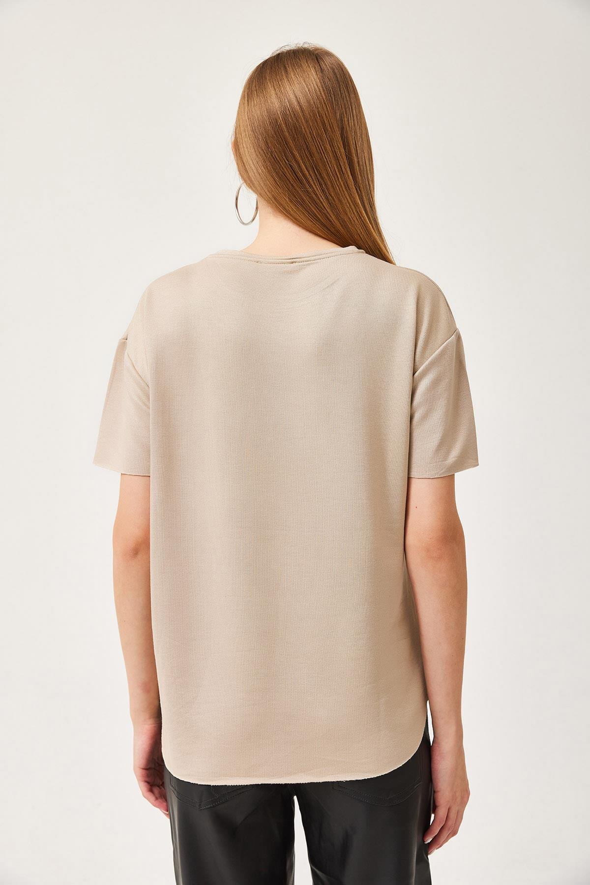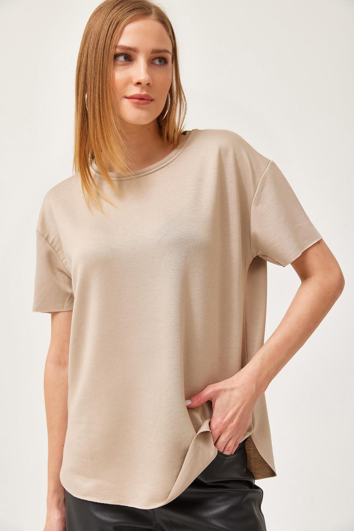 Oysh Yumuşak Dokulu Eteği Oval Modal Tshirt Bej (250014TSHXBEJ)