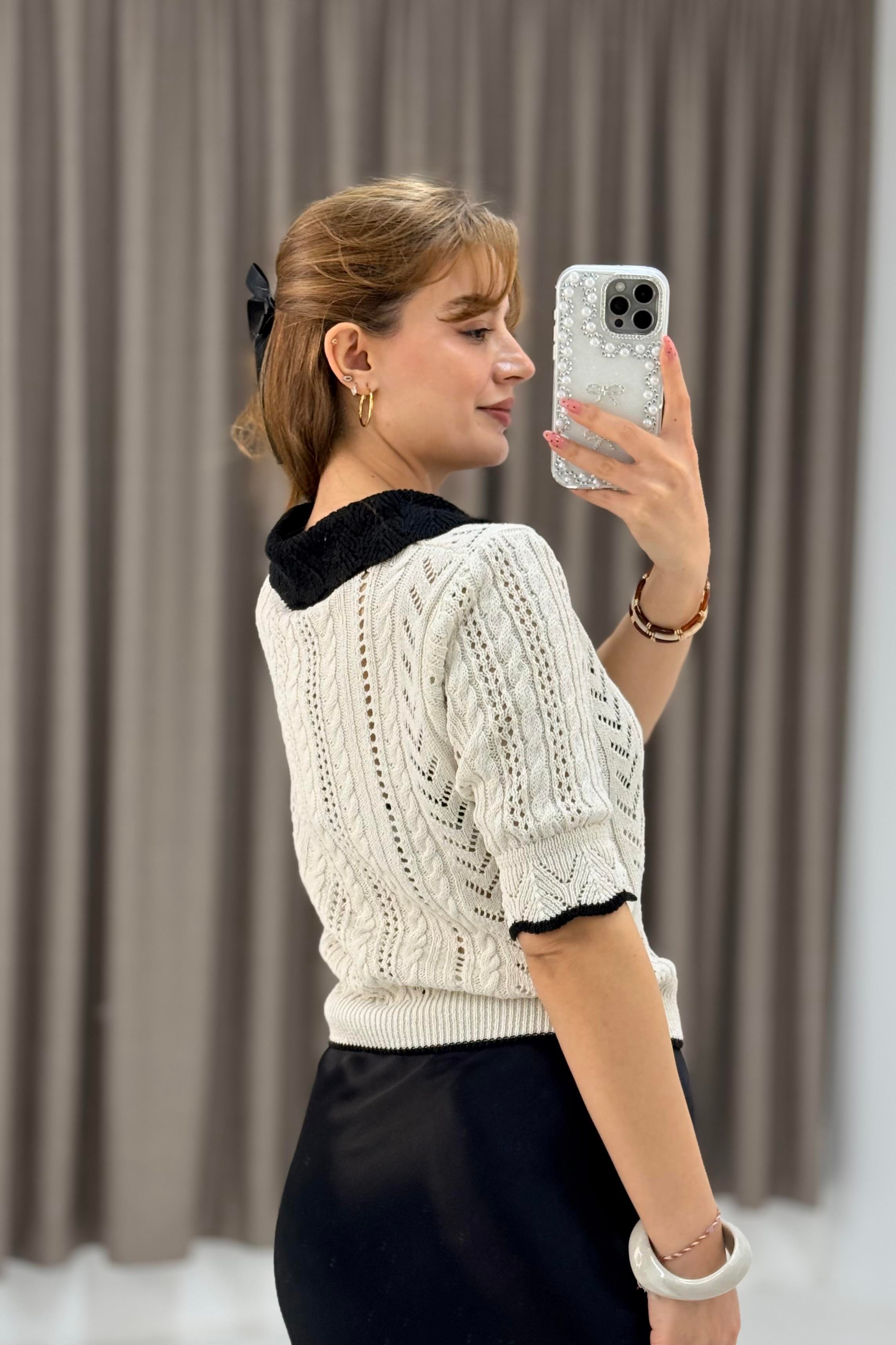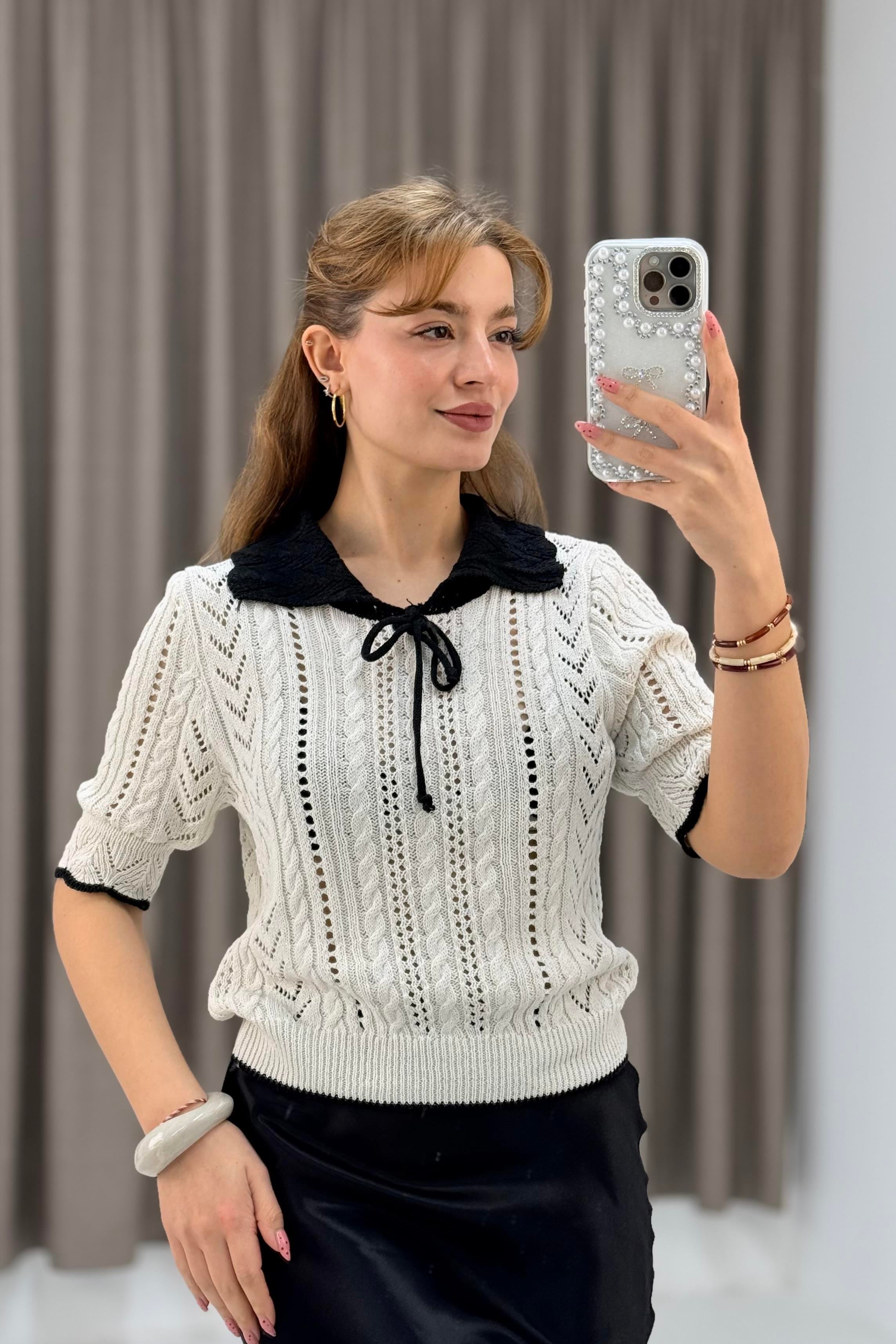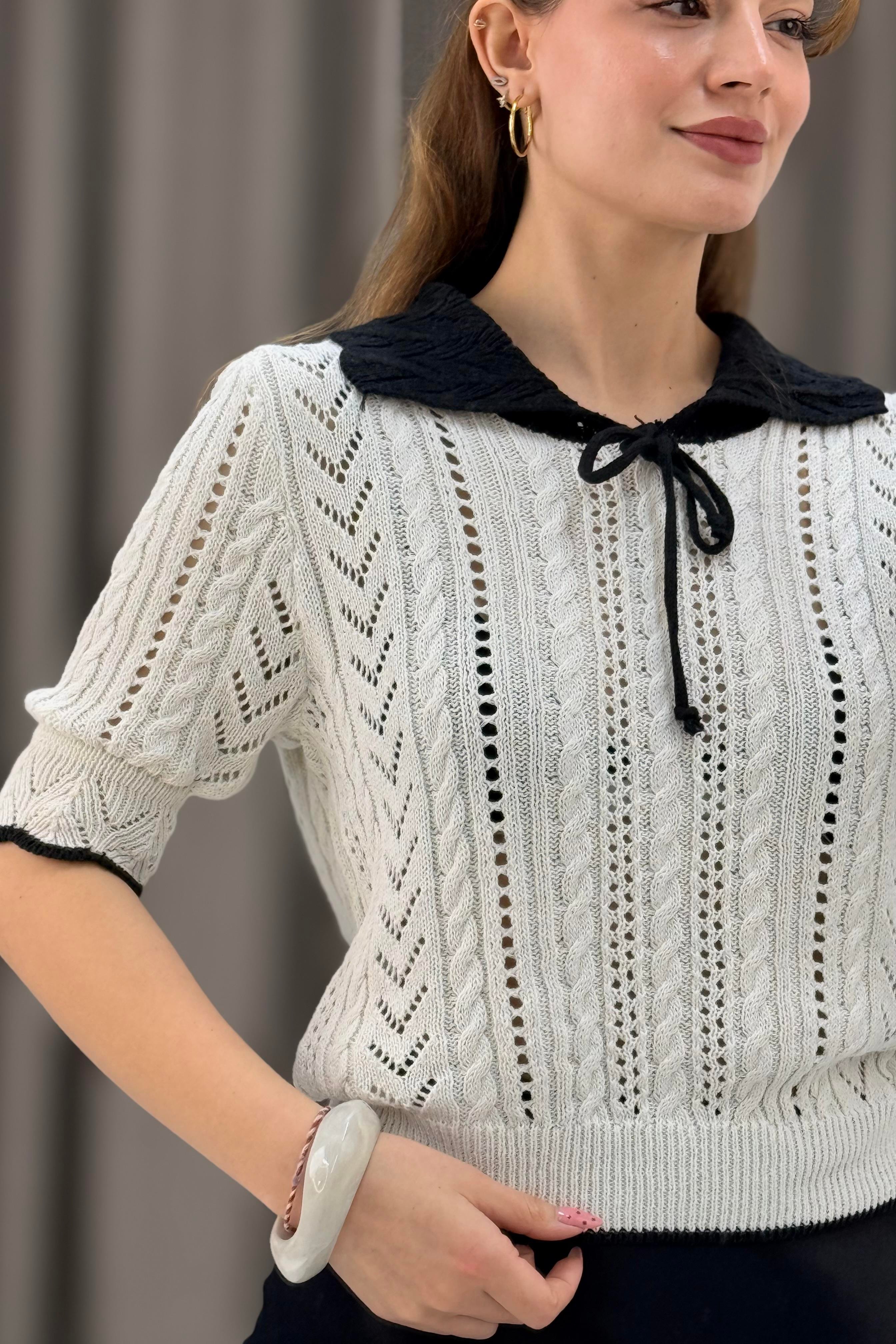 Polo Yaka Ajurlu Triko Bluz Bej
