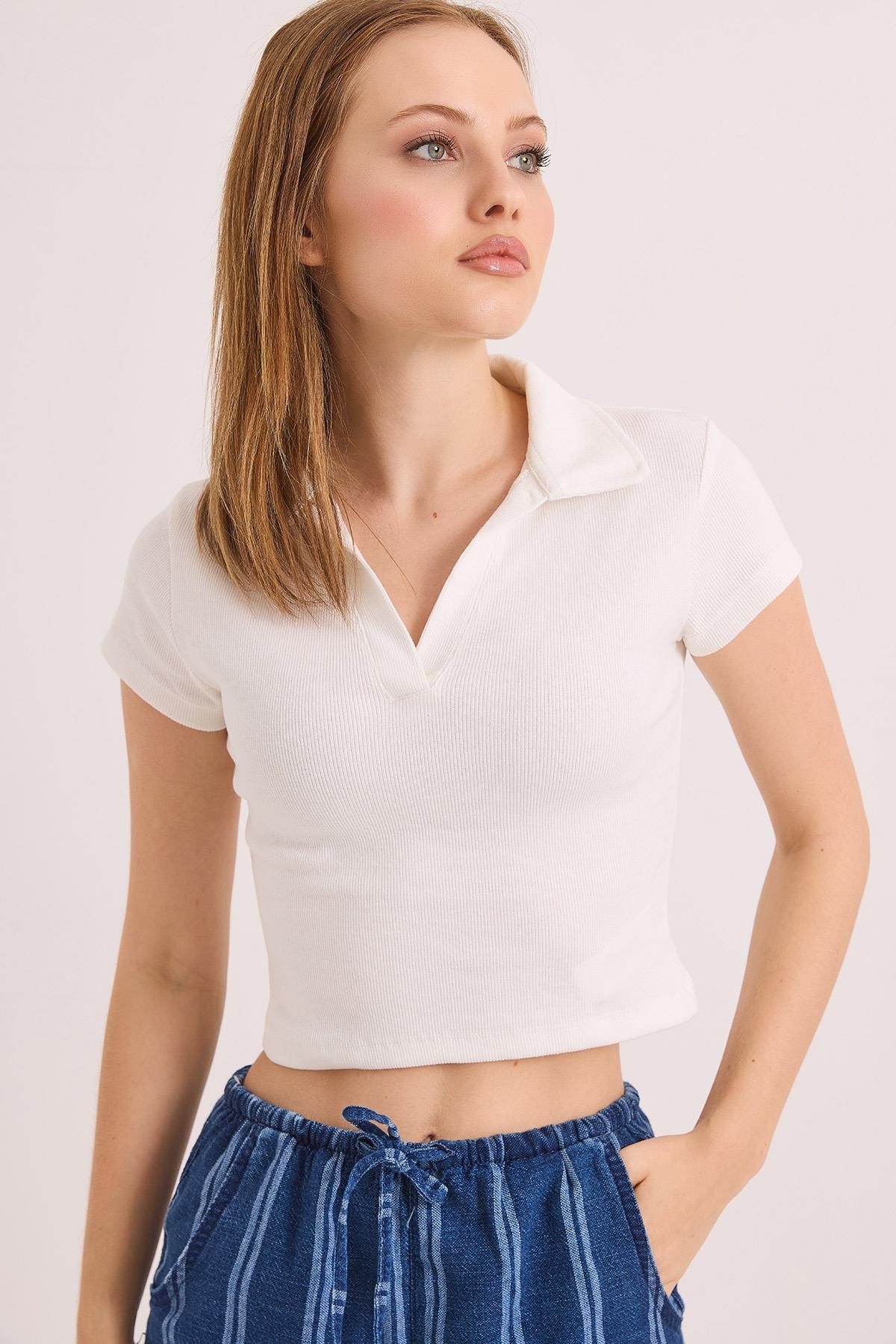 Polo Yaka Basıc Kısa Kollu Örme Kaşkorse Crop Bluz Beyaz (250861BLZXBYZ)
