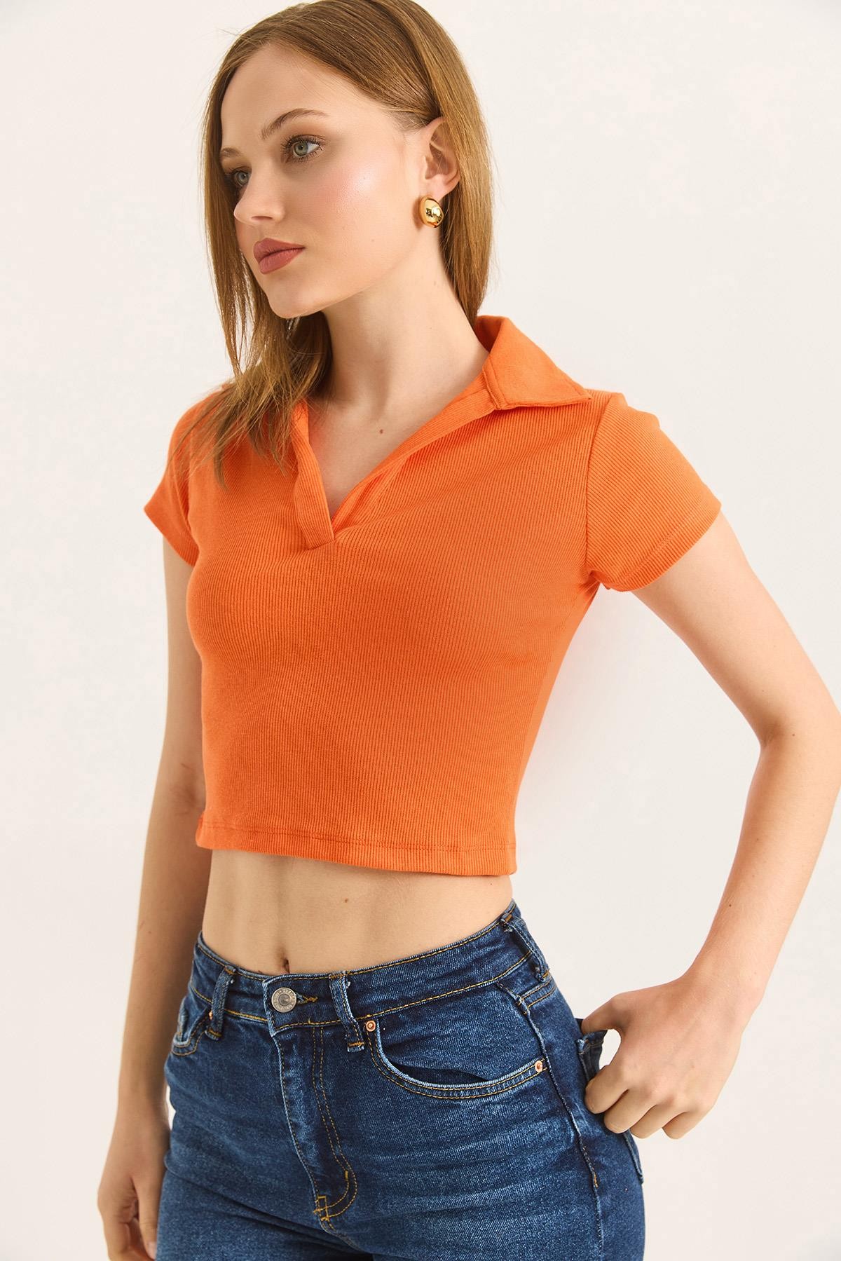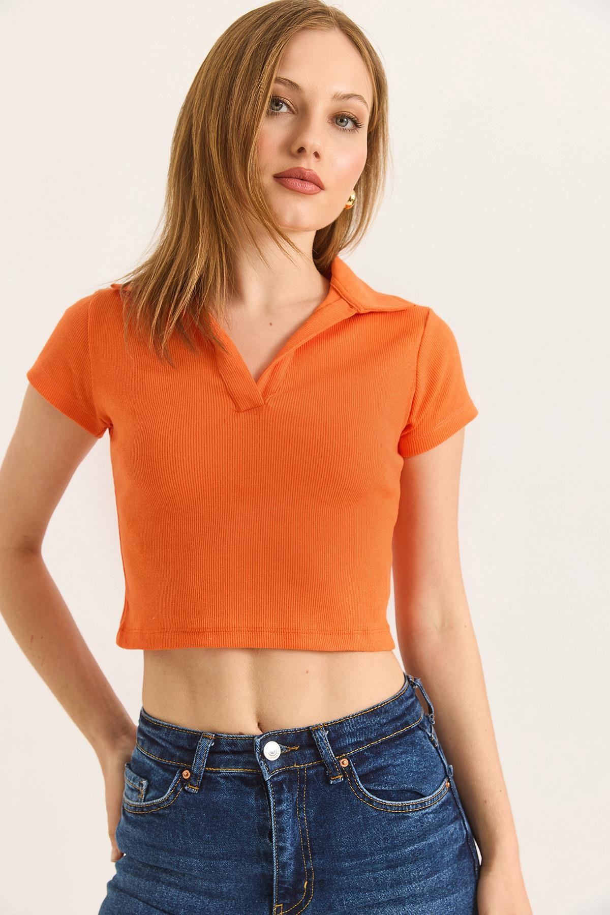 Polo Yaka Basıc Kısa Kollu Örme Kaşkorse Crop Bluz Portakal (250861BLZXPRT)