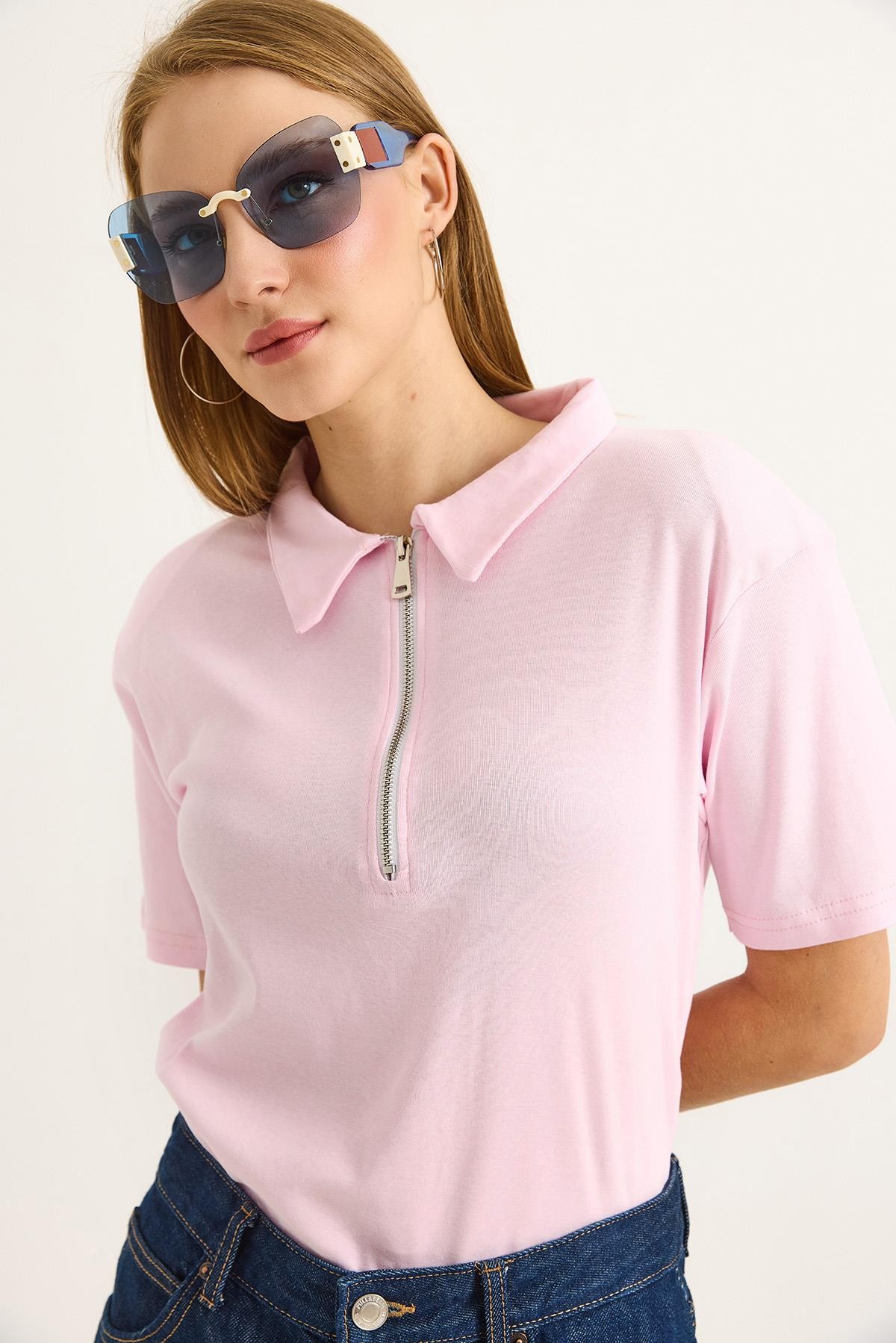 Polo Yaka Yarı Yarım Fermuarlı Kadın Tshirt Pembe (251174TSHXPMB)
