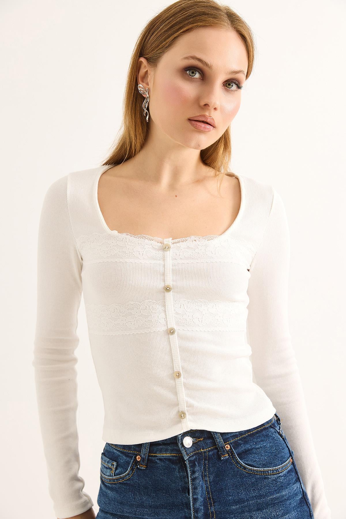 Kare Yaka Uzun Kollu Fitilli Bluz Beyaz (251082BLZXBYZ)