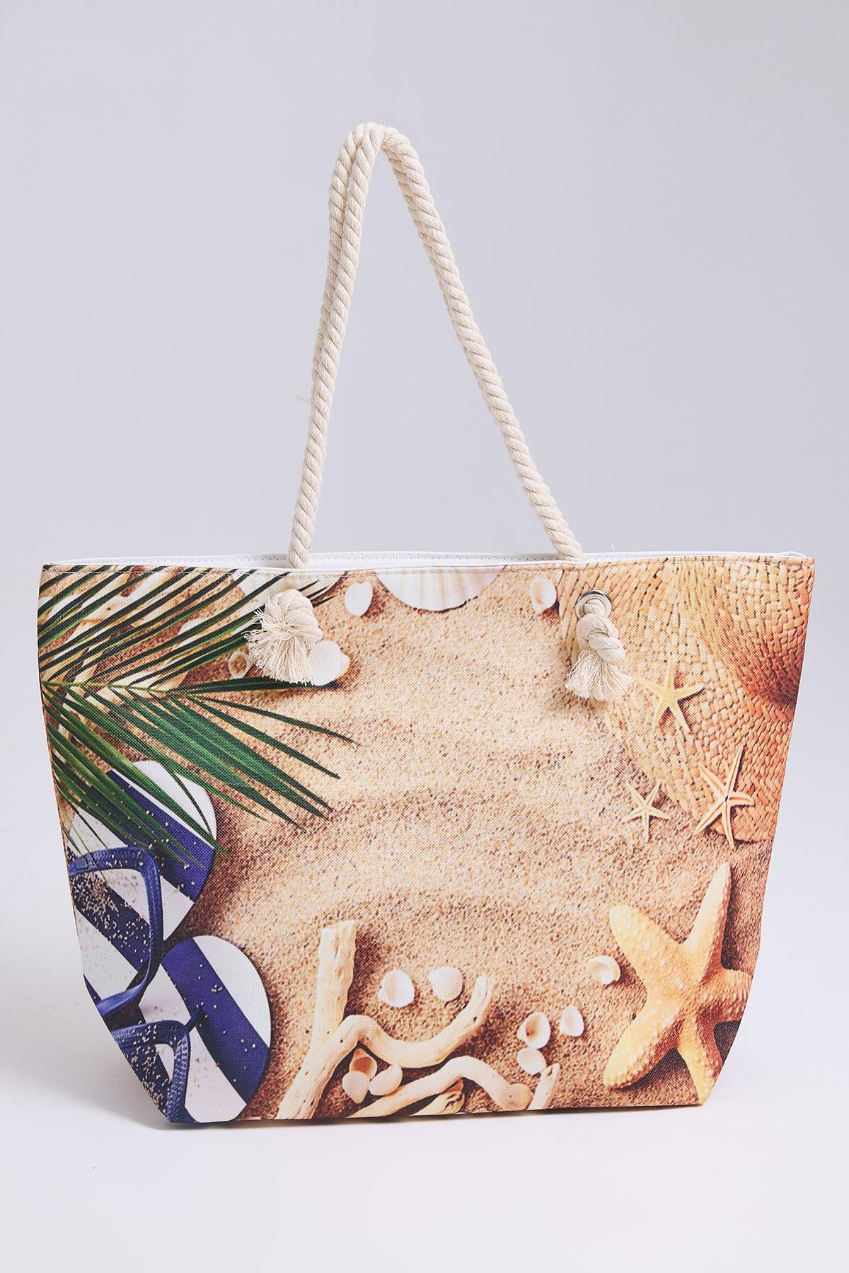 Renkli Desenli Kadın Plaj Çantası Vizon (250817CNTXVZN)