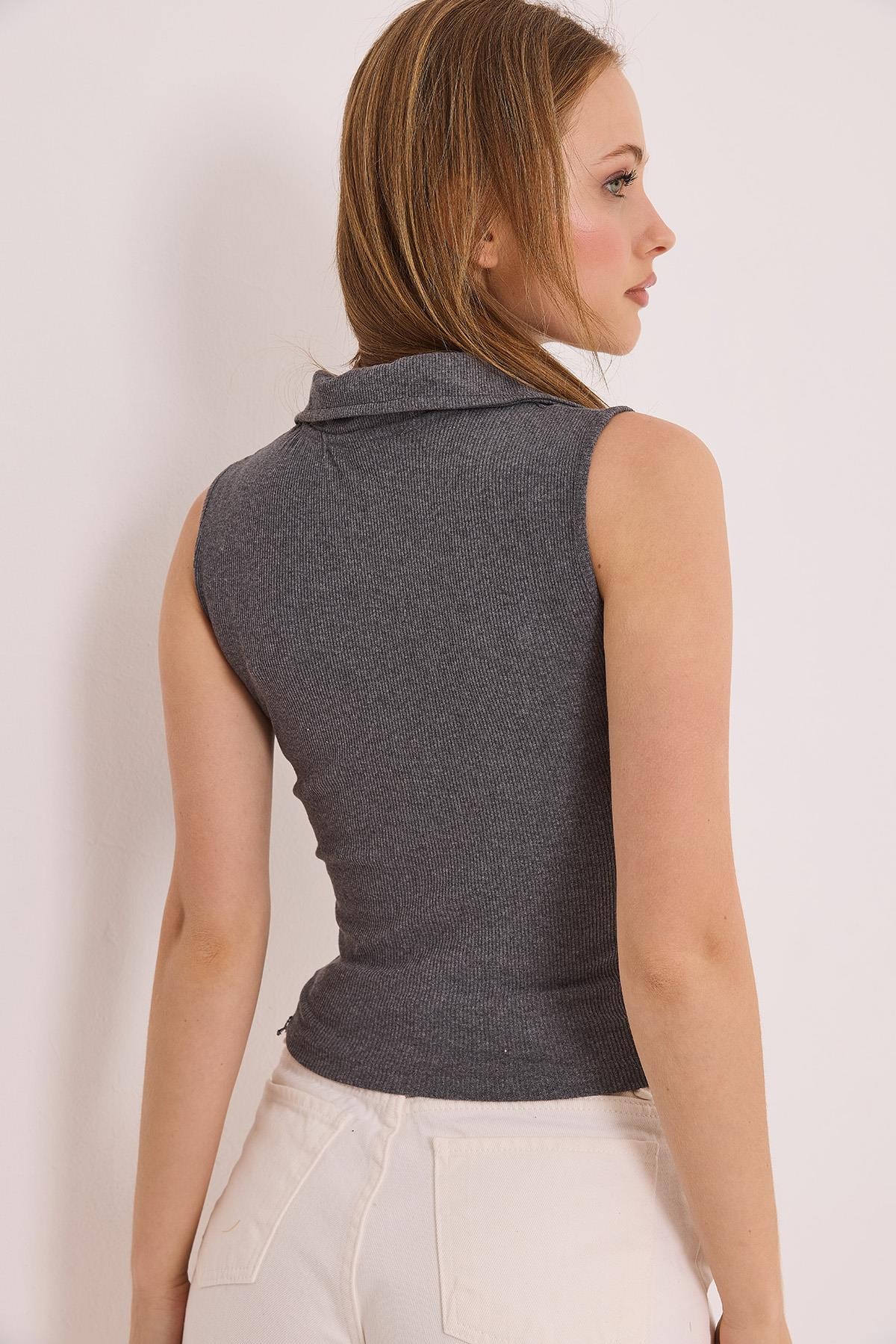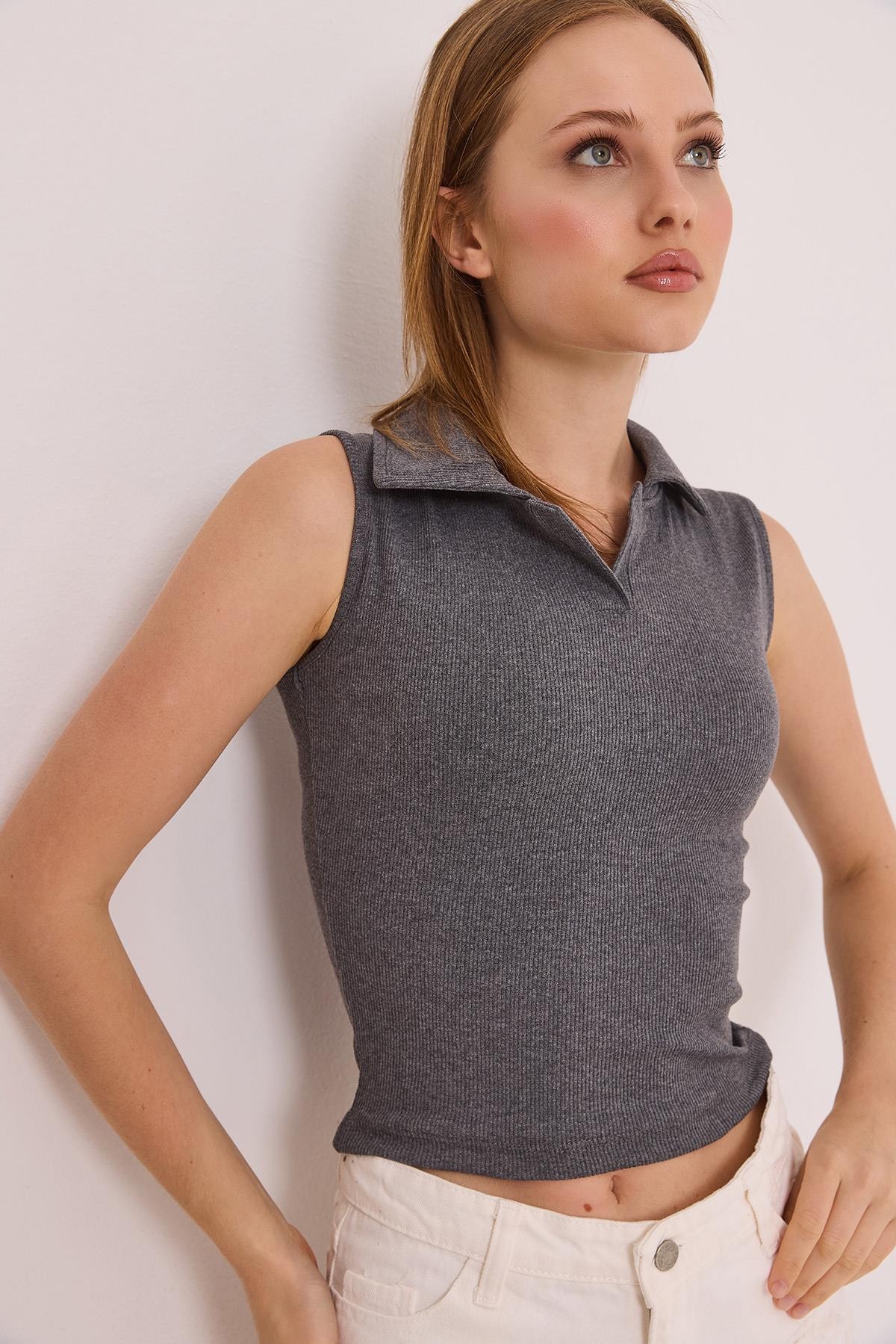 Sıfır Kol Polo Yaka Basıc Örme Kaşkorse Bluz Füme (250864BLZXFME)