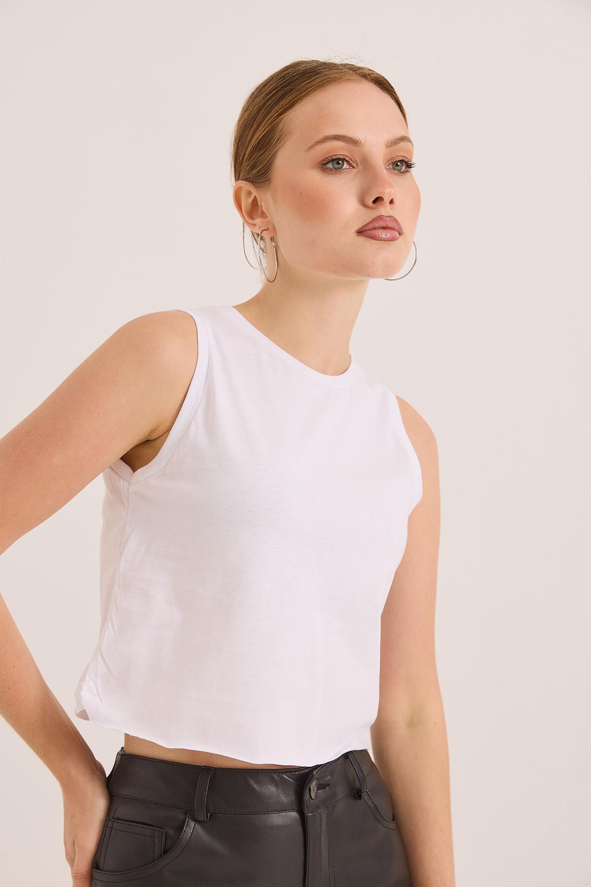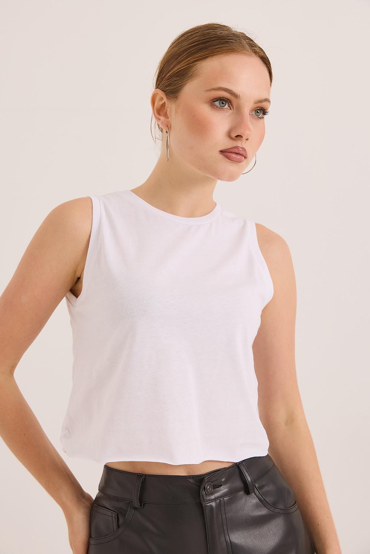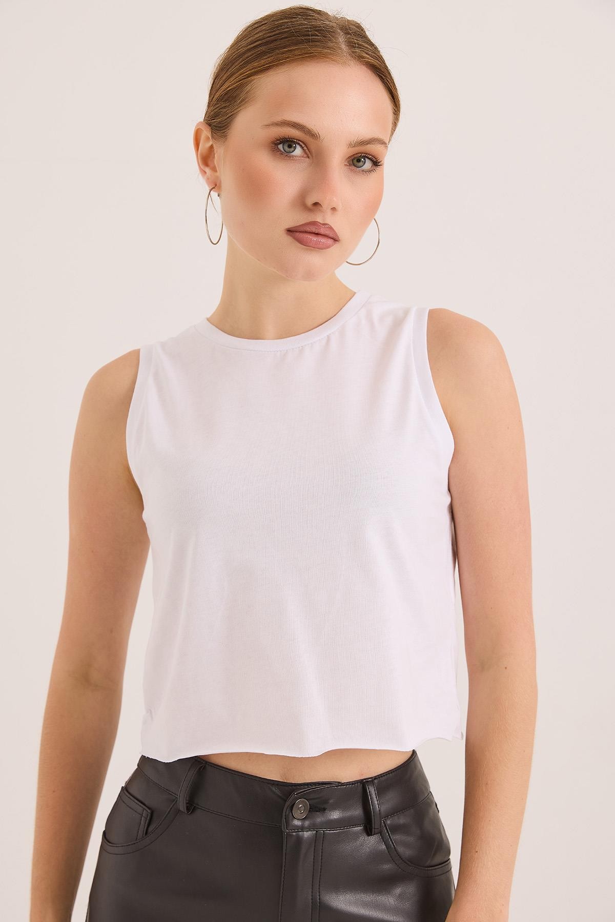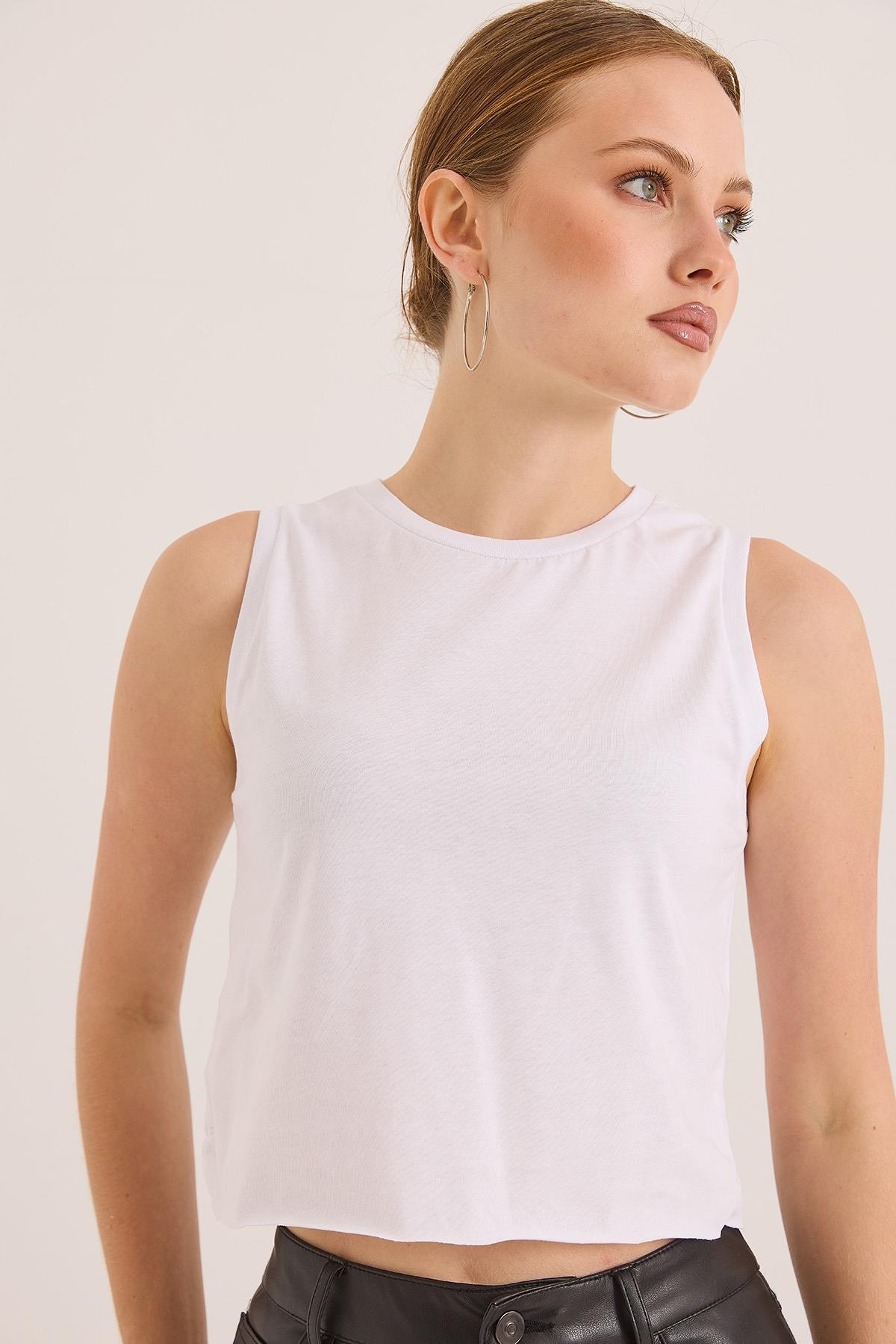Sıfır Kol Yuvarlak Yaka Havalı Crop Tshirt Beyaz (250741TSHXBYZ)