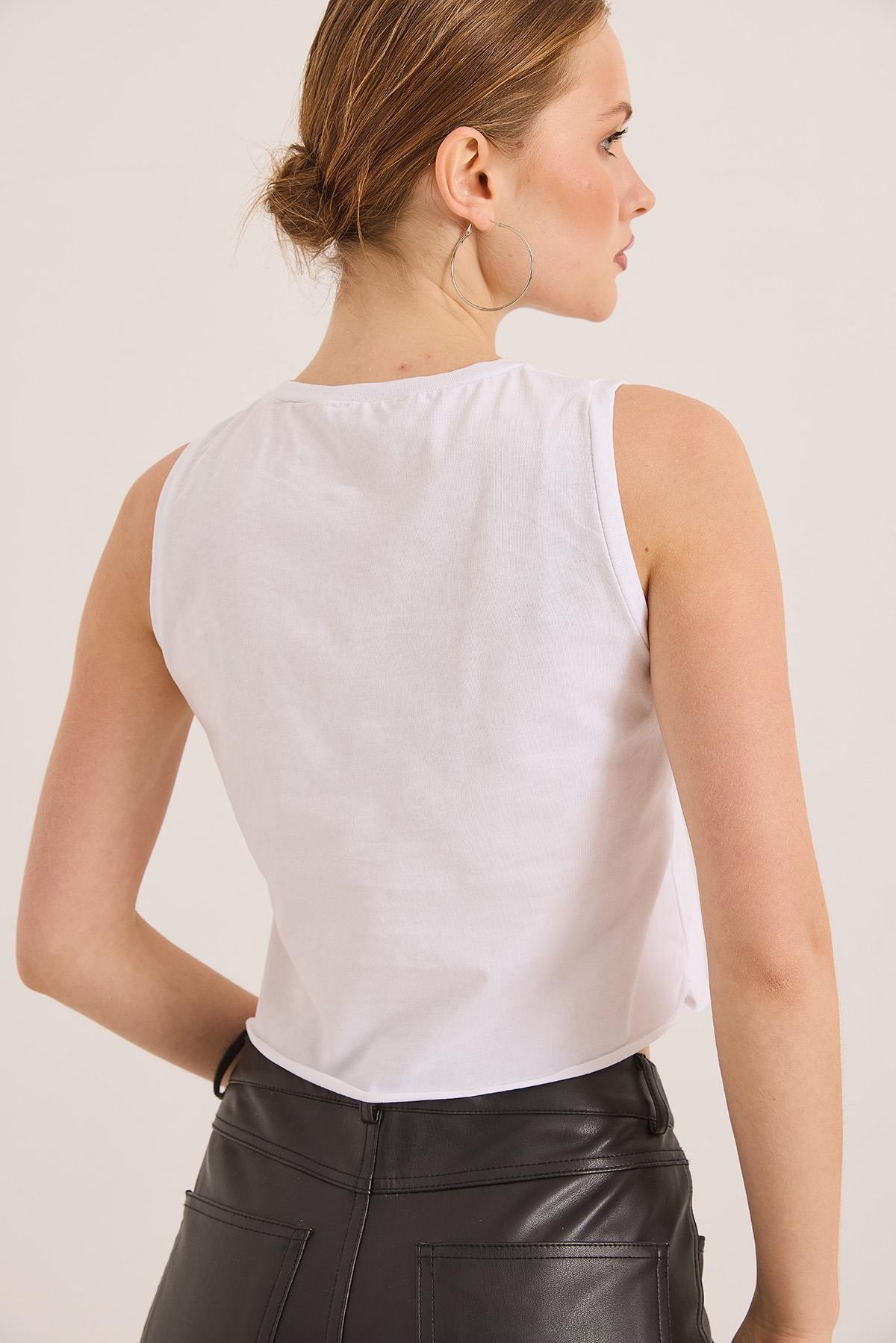Sıfır Kol Yuvarlak Yaka Havalı Crop Tshirt Beyaz