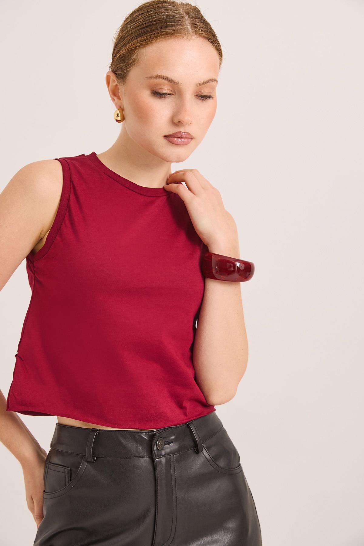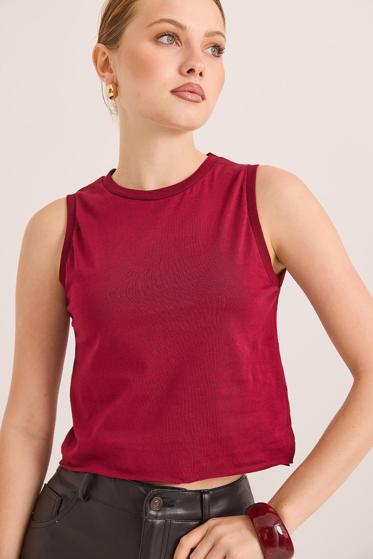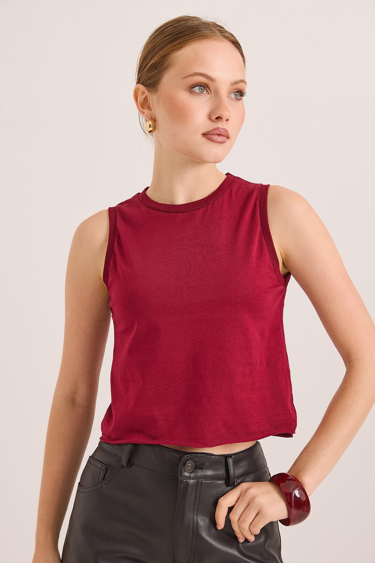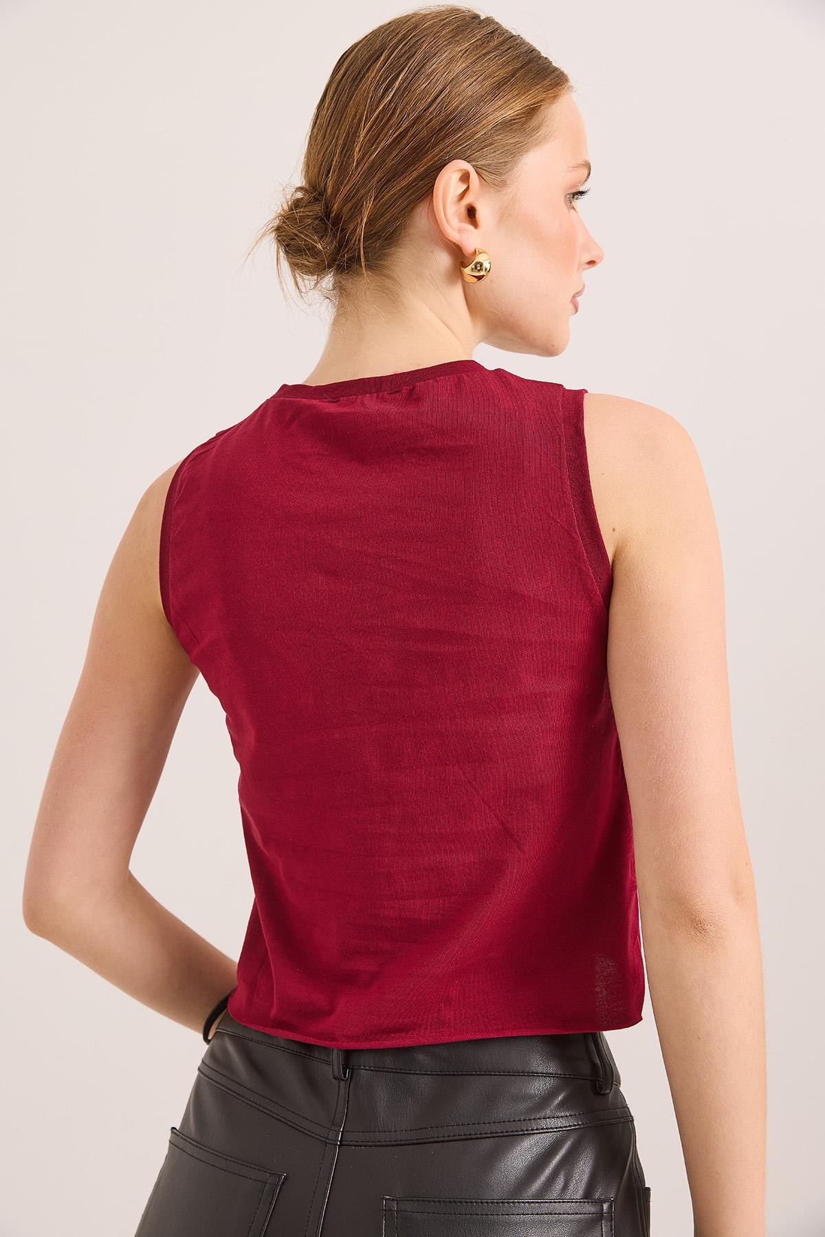 Sıfır Kol Yuvarlak Yaka Havalı Crop Tshirt Bordo (250741TSHXBRD)