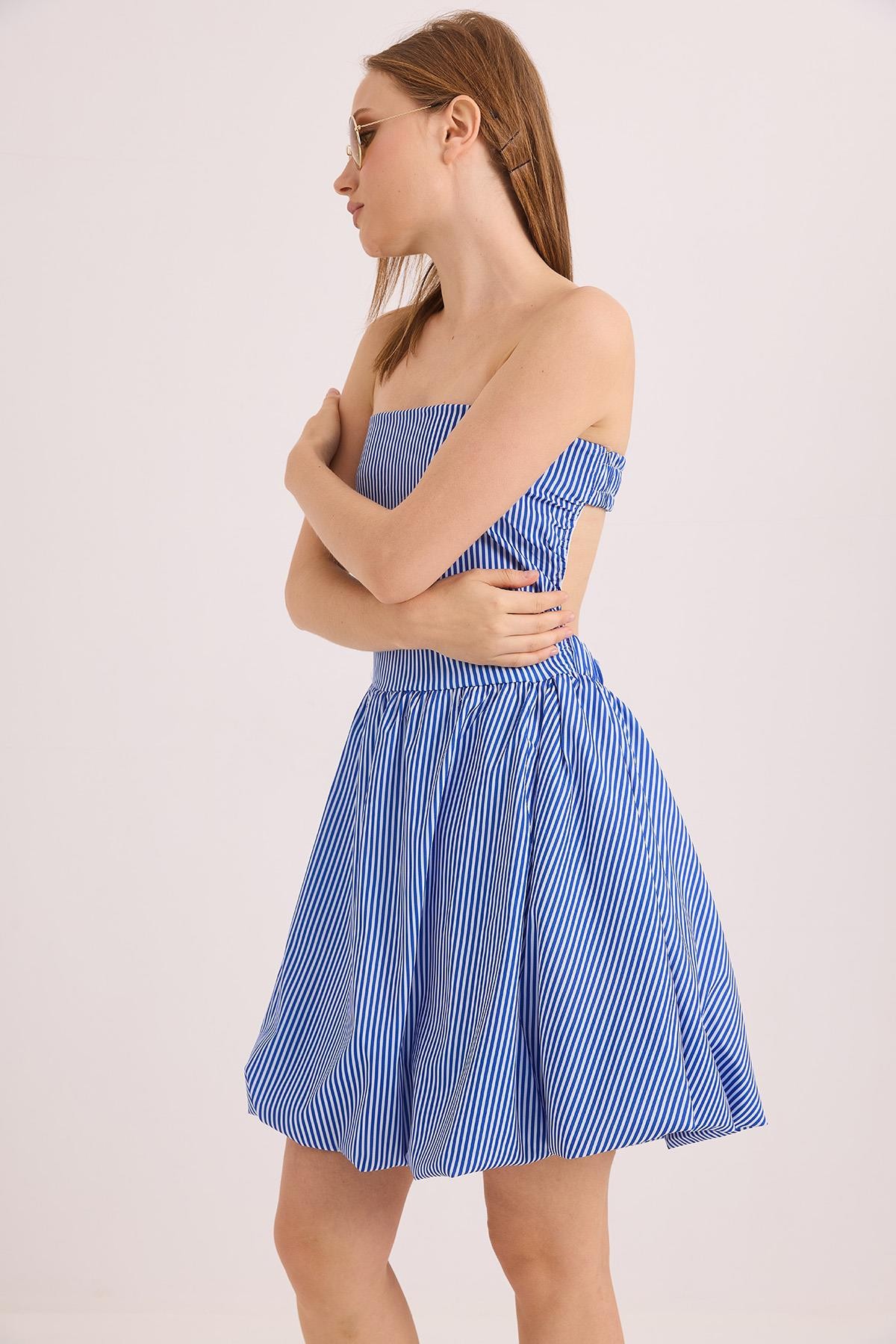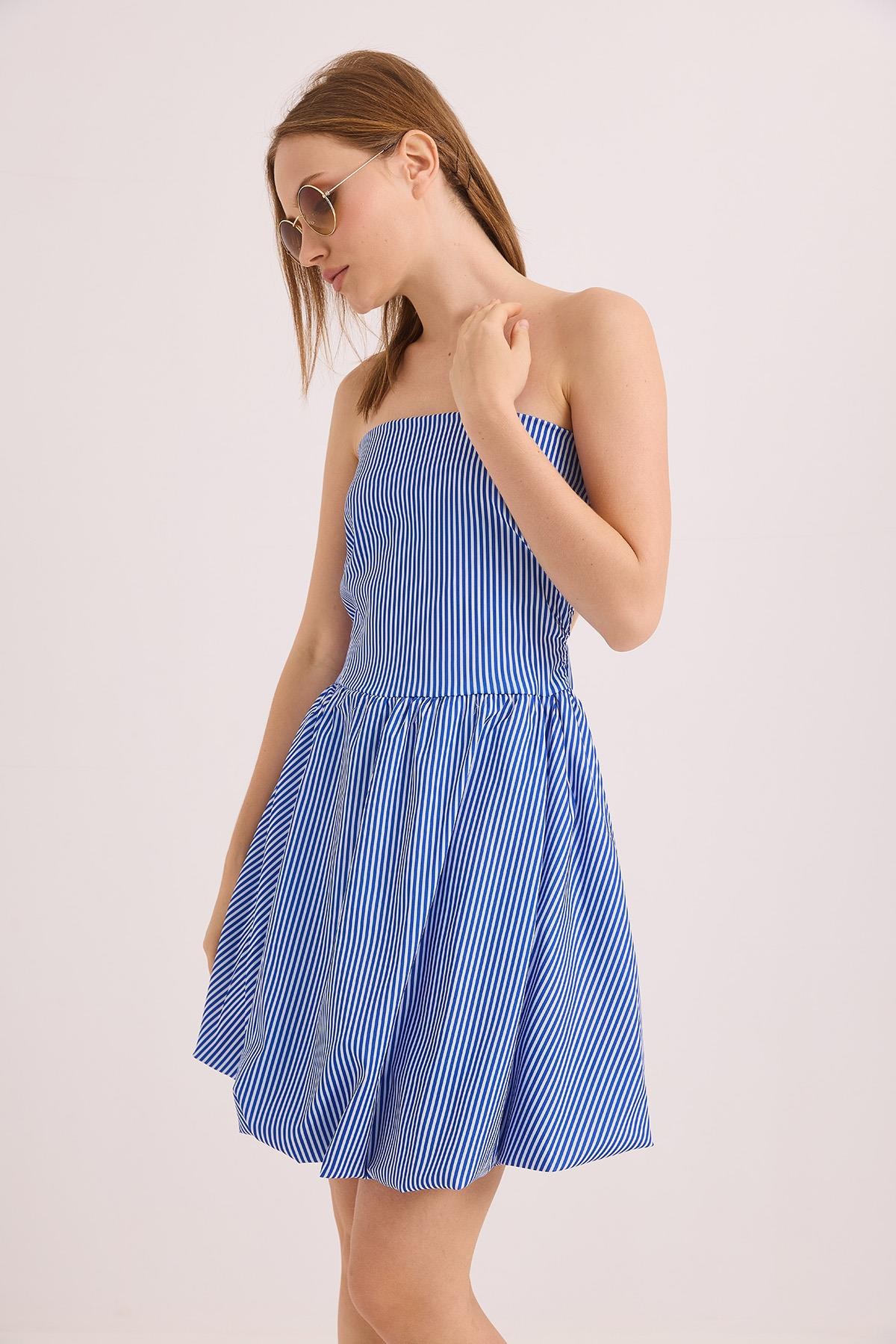 Sırt Detaylı Straplez Mini Dokuma Elbise Mavi