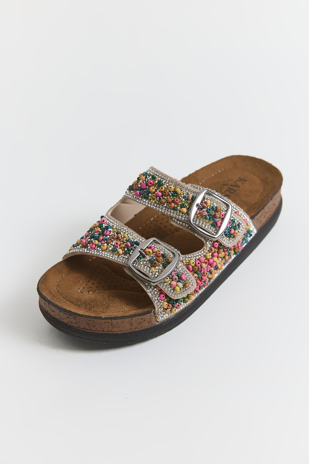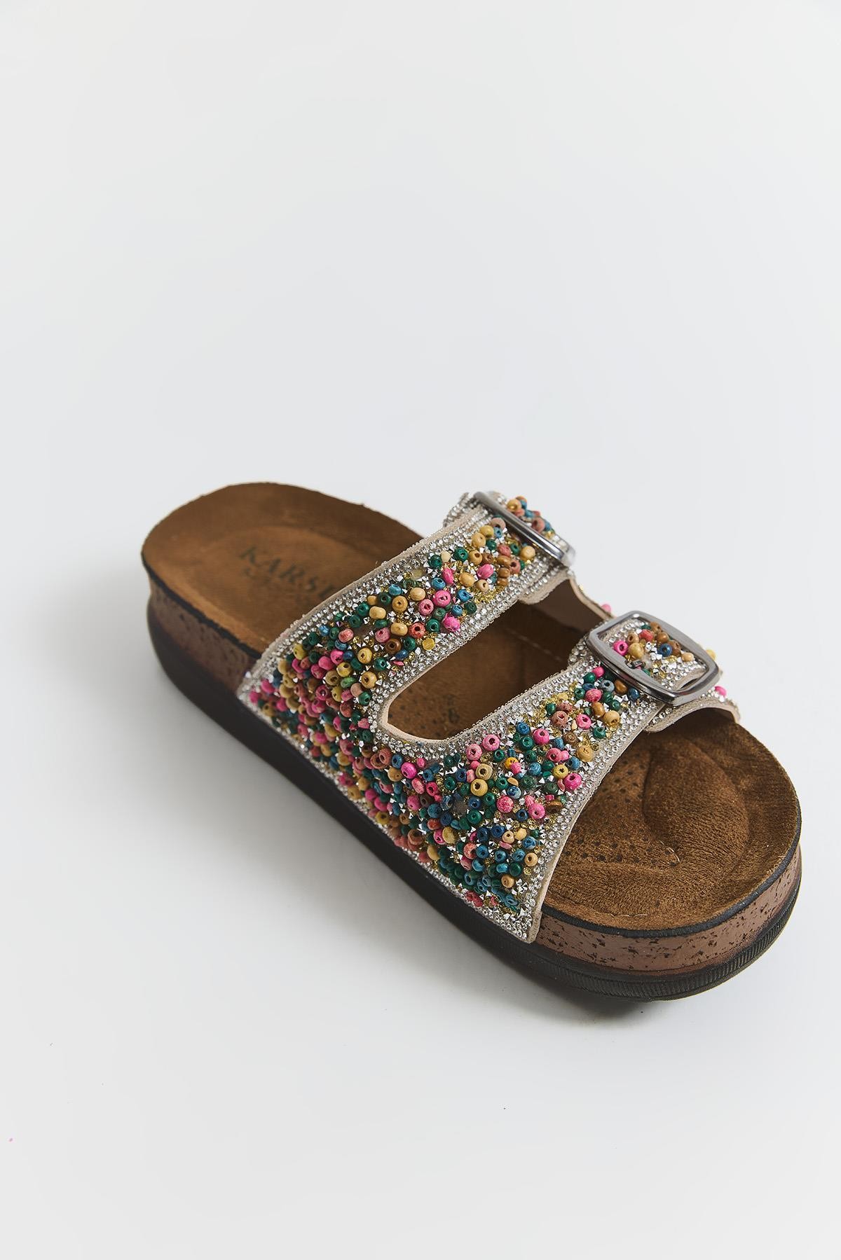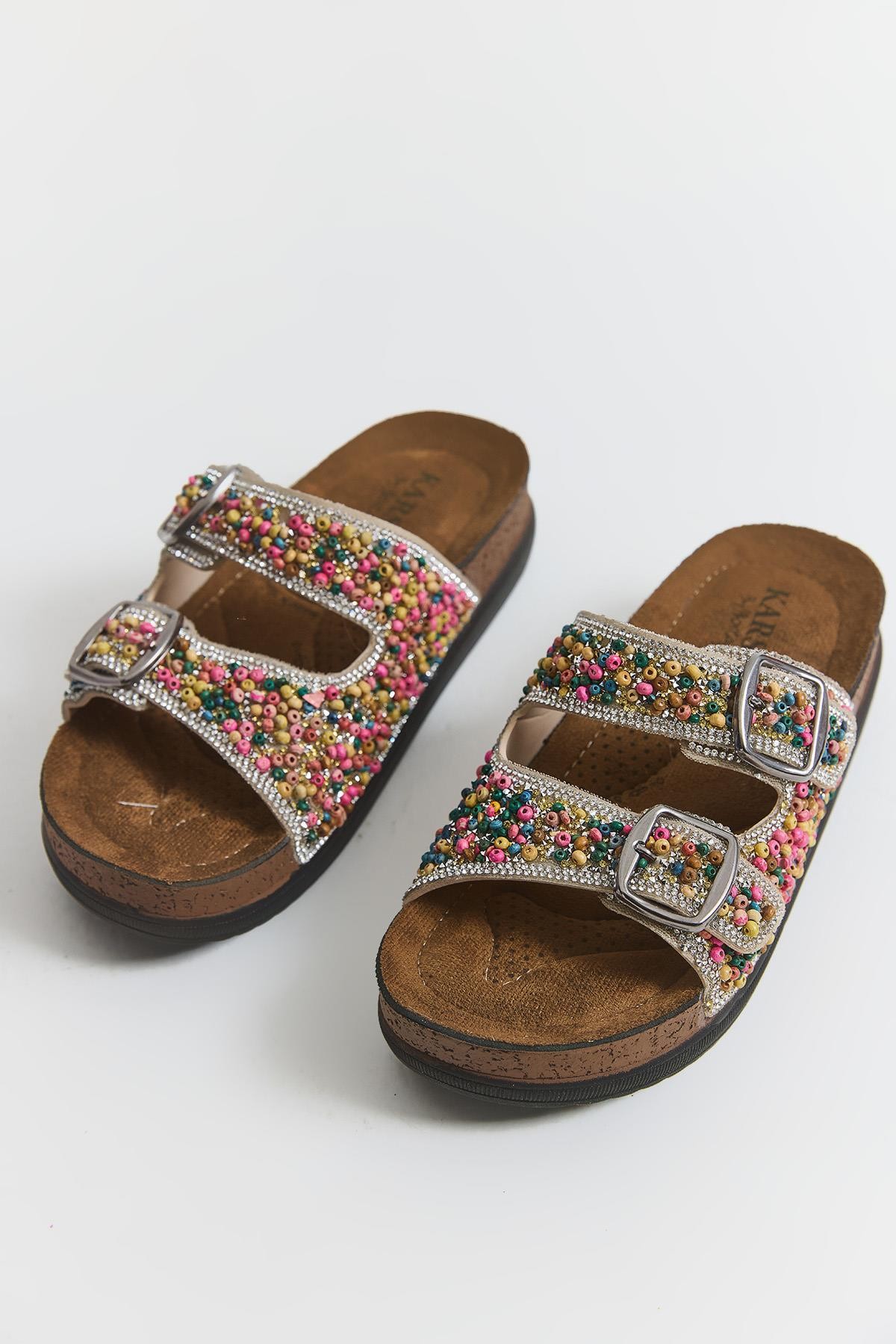 Taş Detaylı Çift Tokalı Kadın Terlik Gri