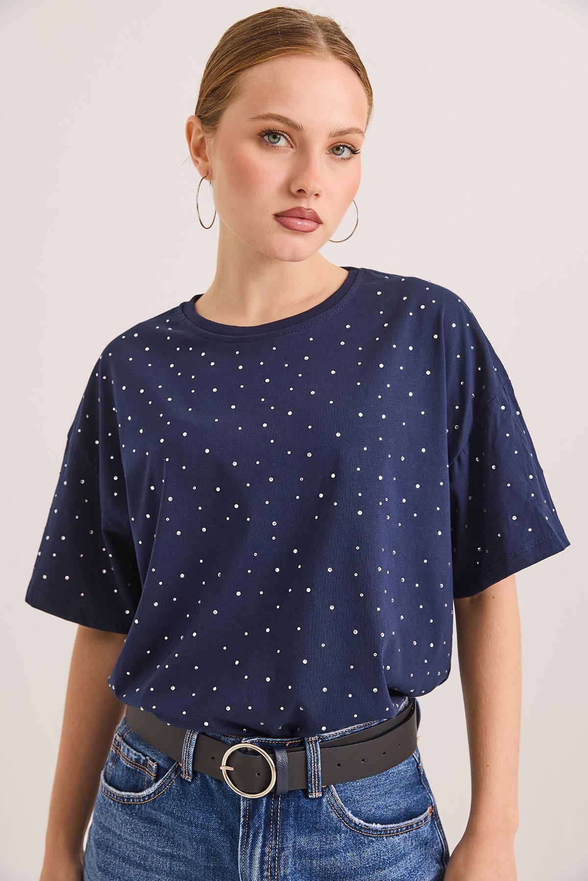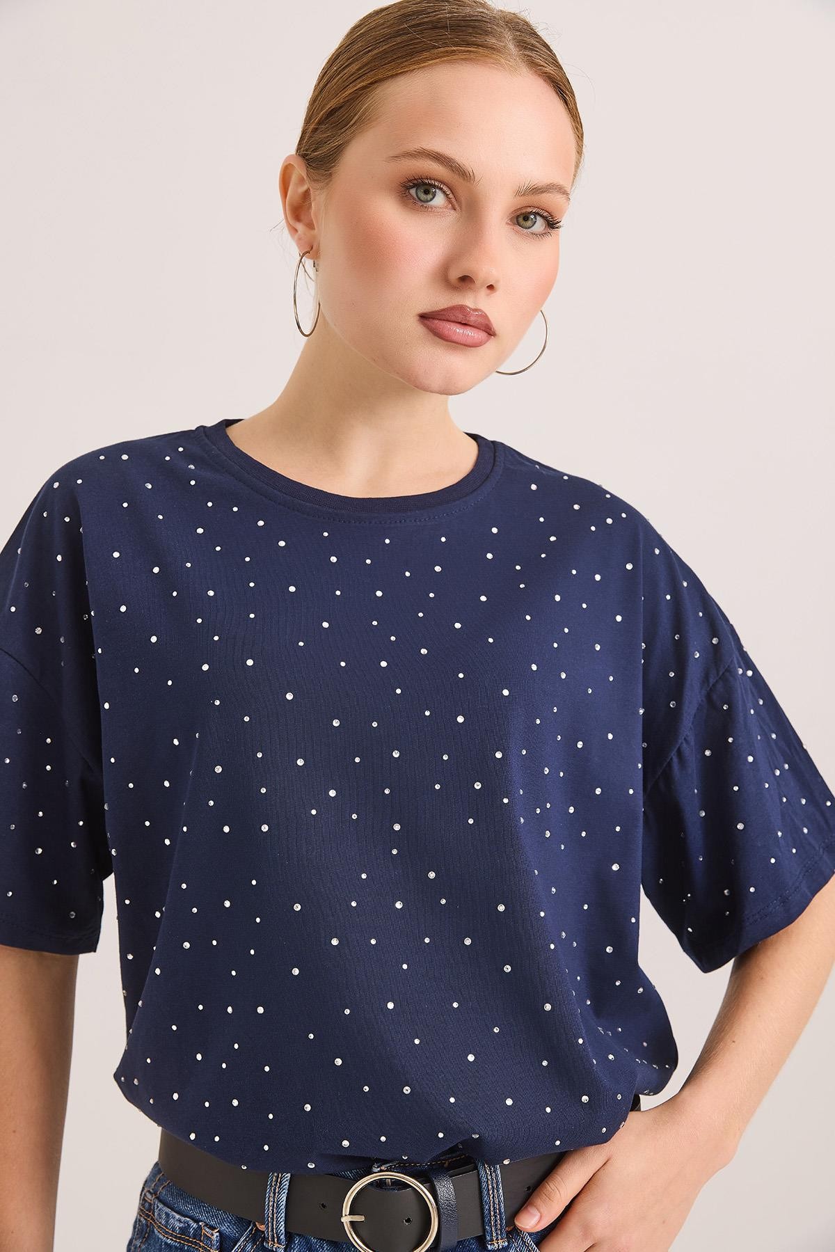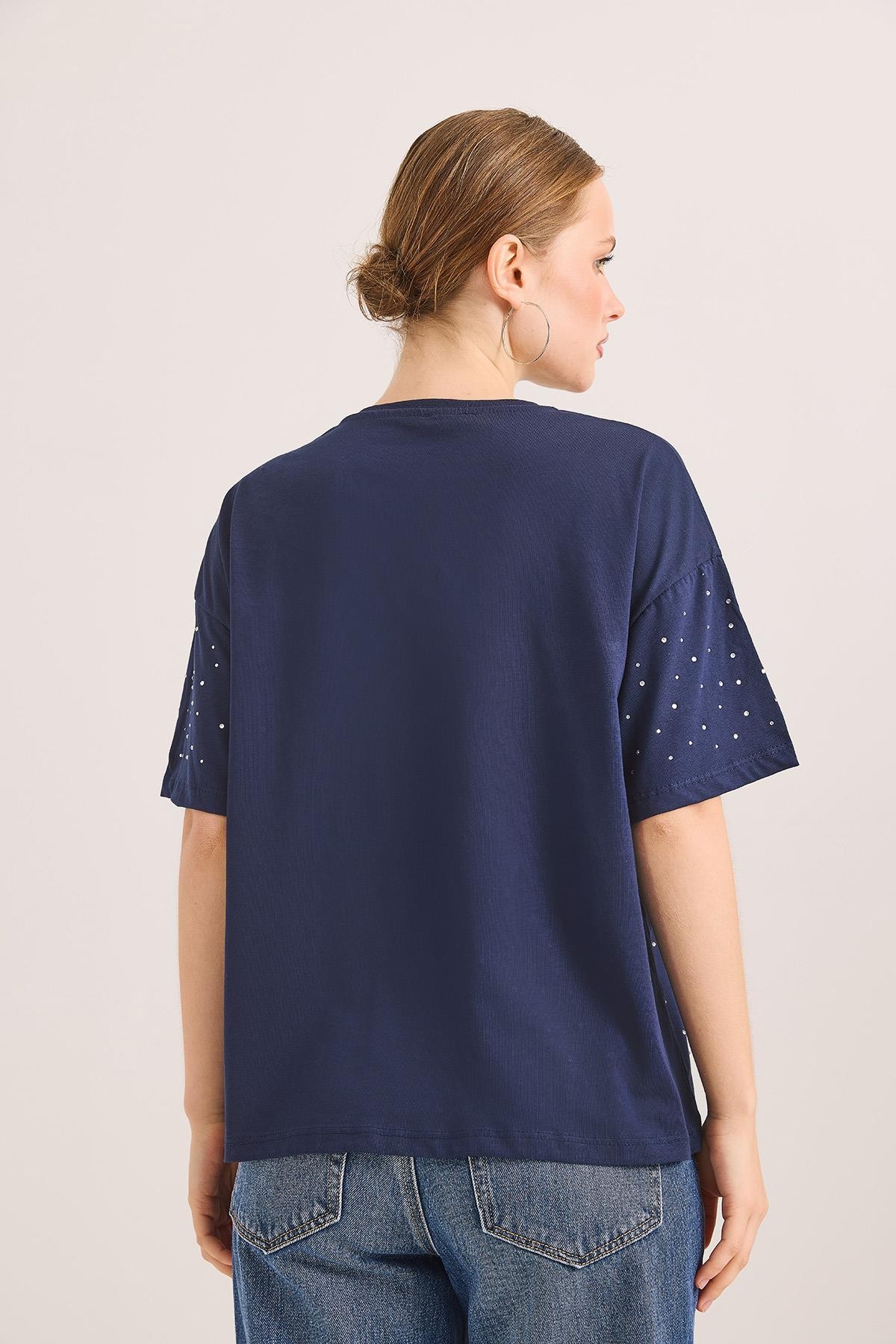 Taş Detaylı Rahat Kalıp Premium Pamuk Tshirt Lacivert (250744TSHXLACİ)