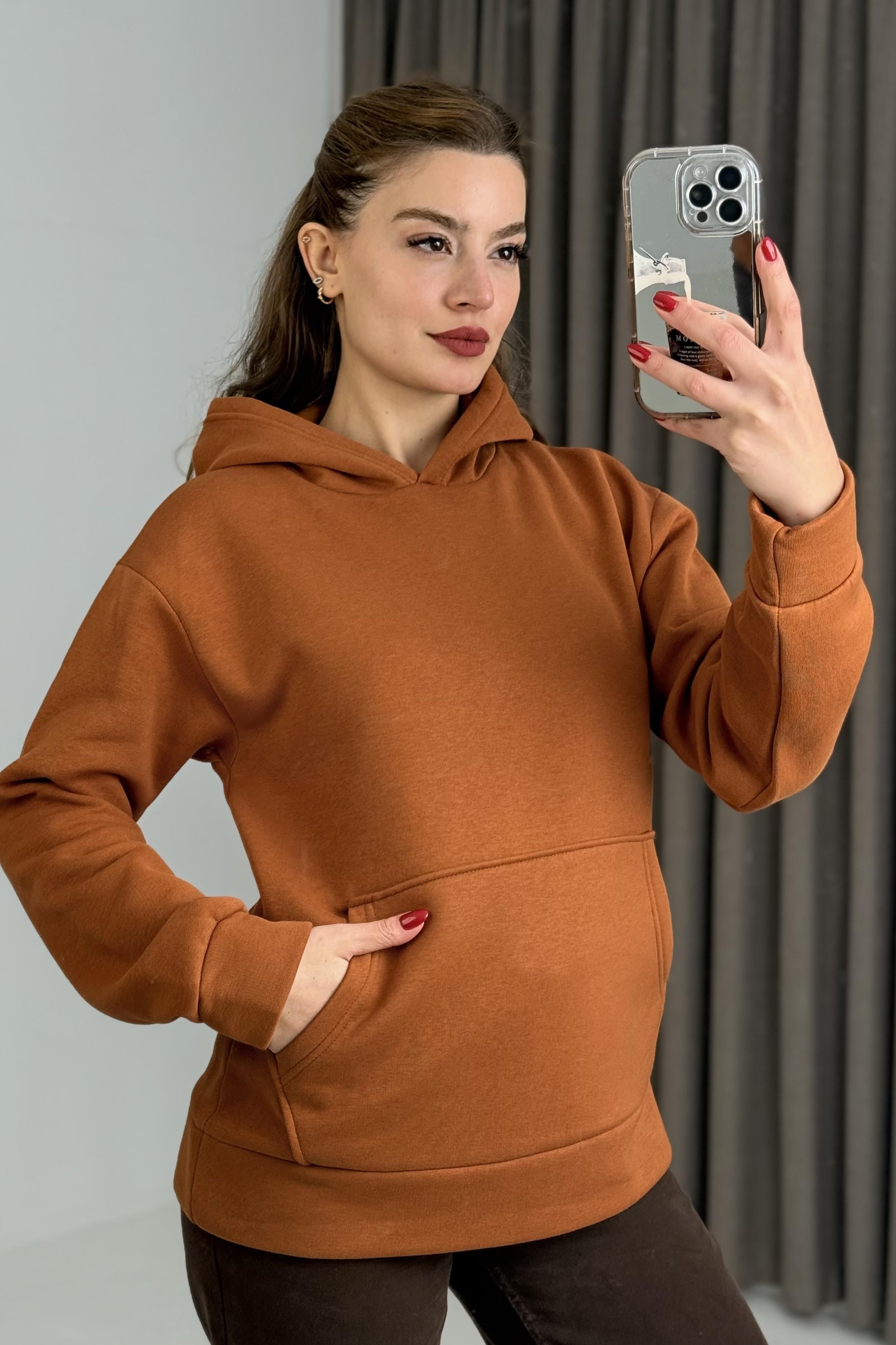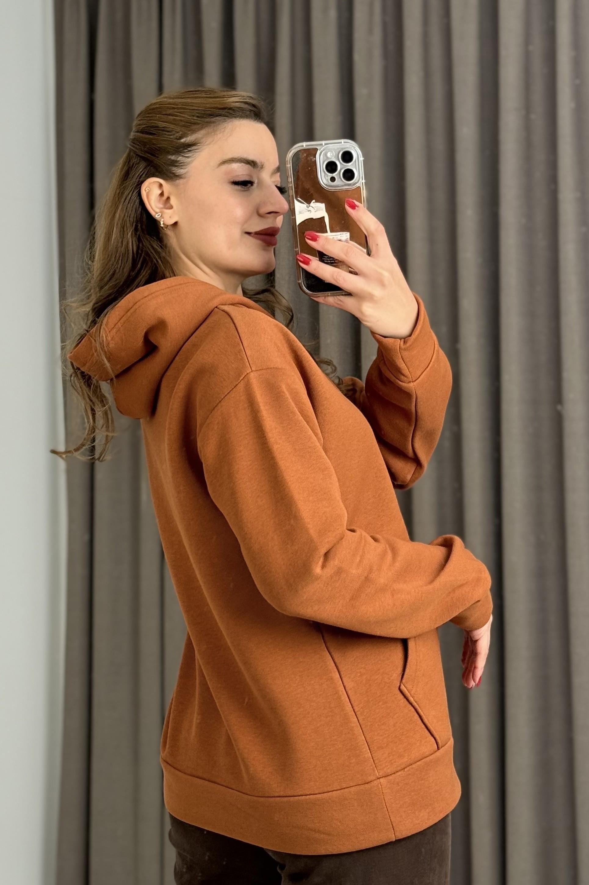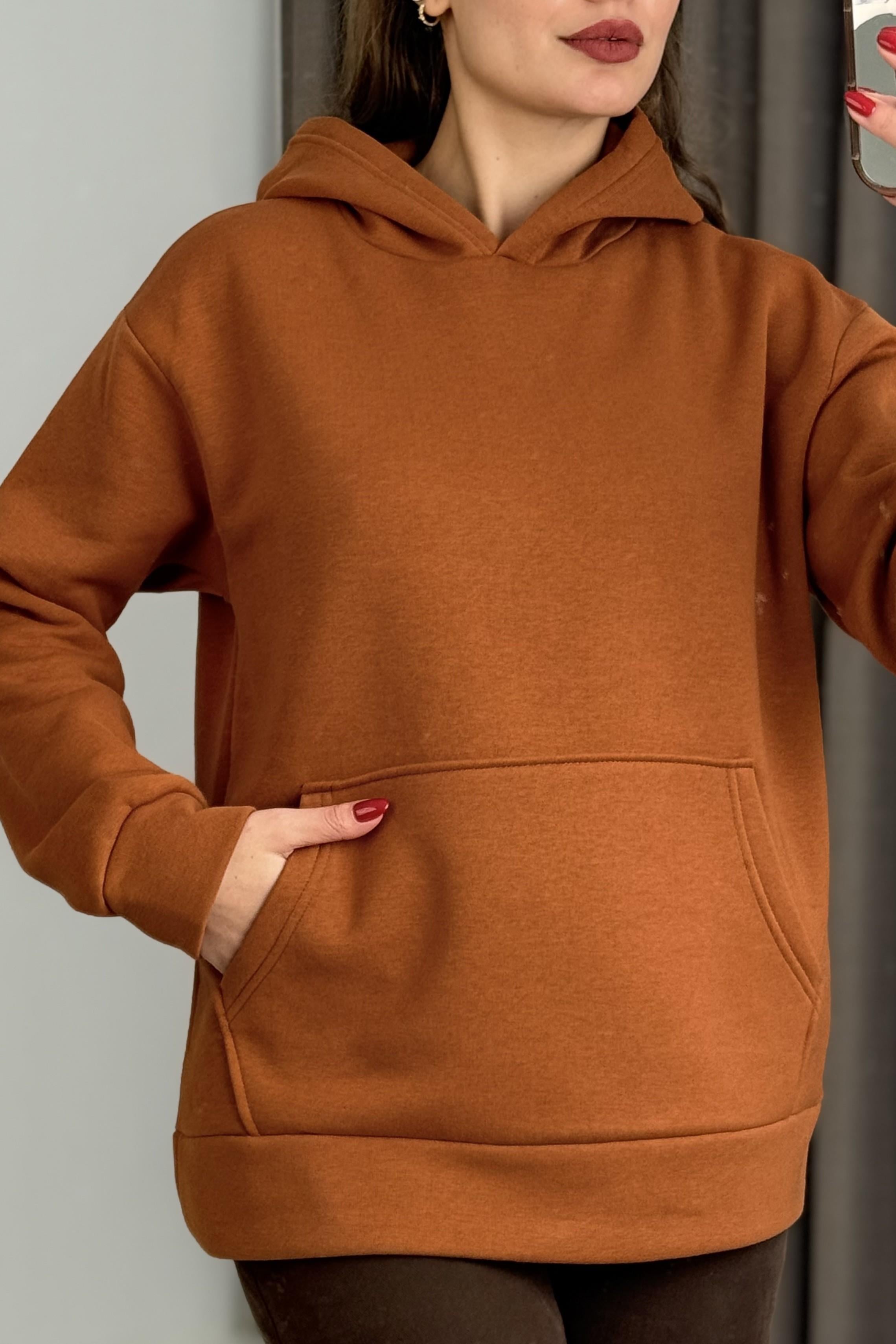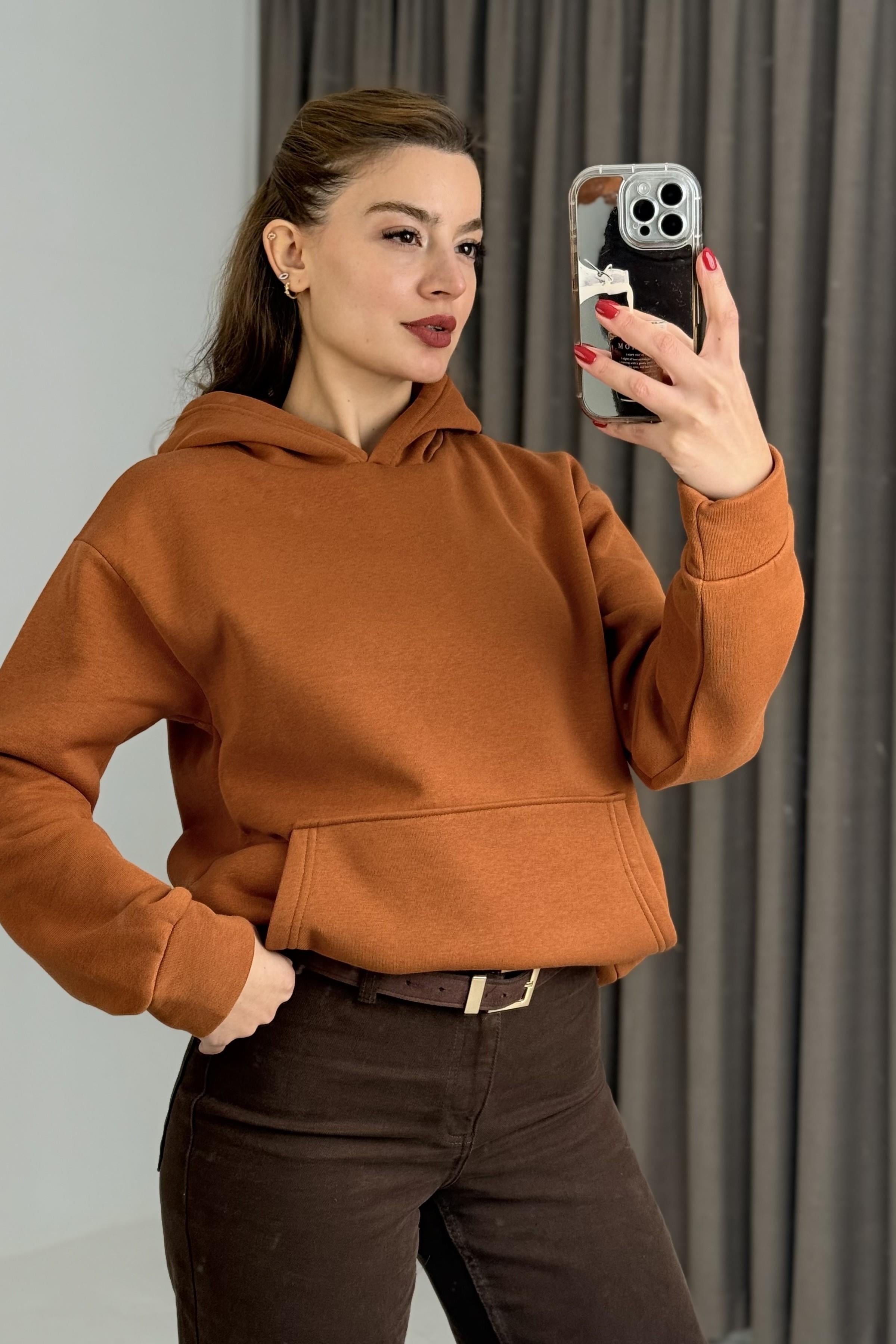 Üç İplik Kiremit Şardonlu Kangru Cepli Kapişonlu Sweat (600020SWTXKRM)