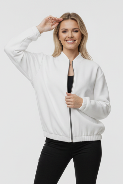 Üç İplik Şardonlu Beyaz Beli Lastikli Fermuarlı Hırka