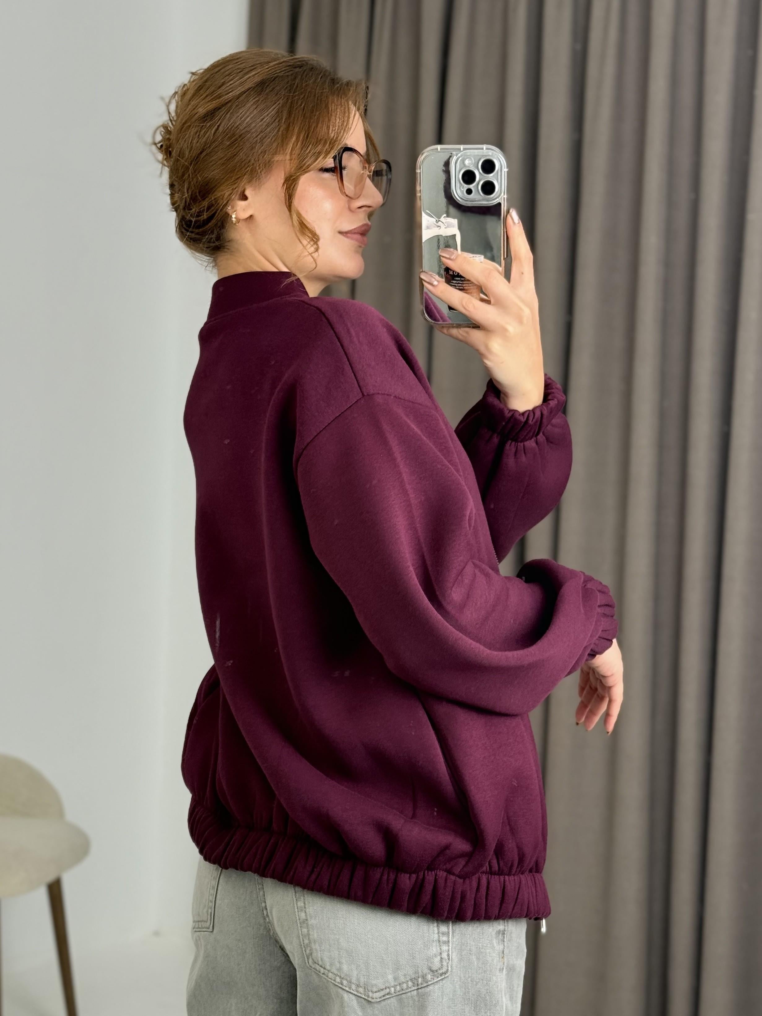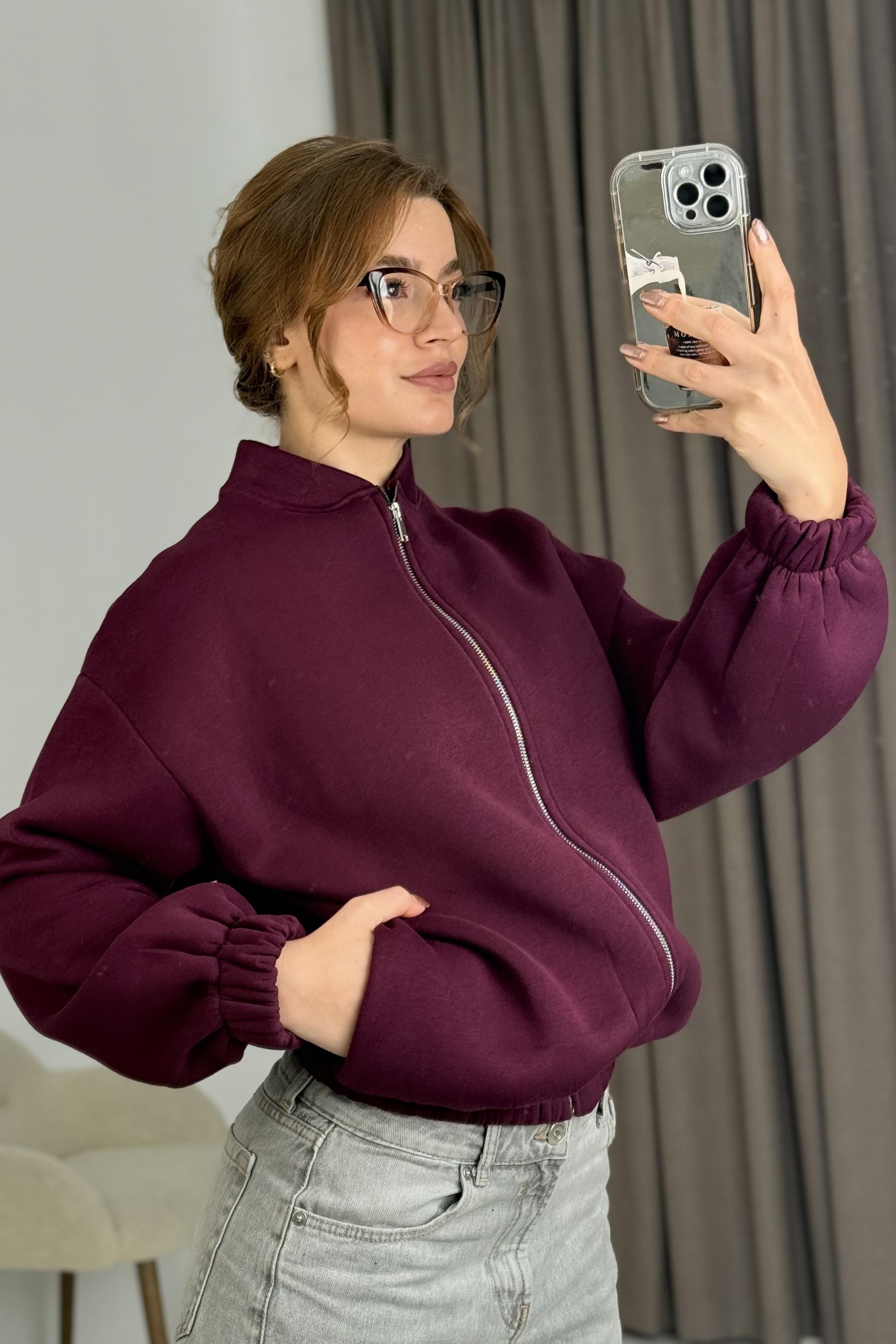 Üç İplik Şardonlu Bordo Beli Lastikli Fermuarlı Hırka