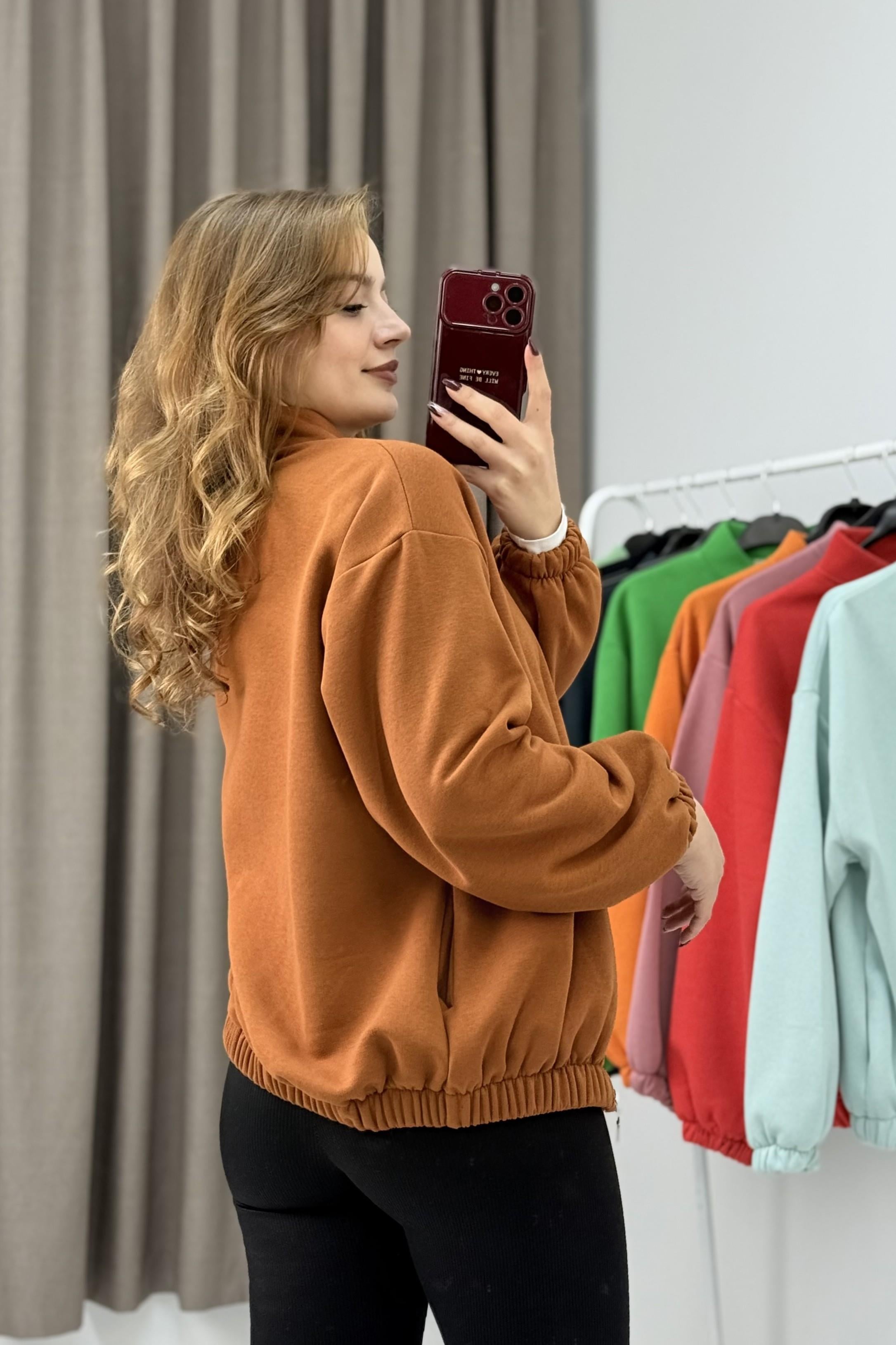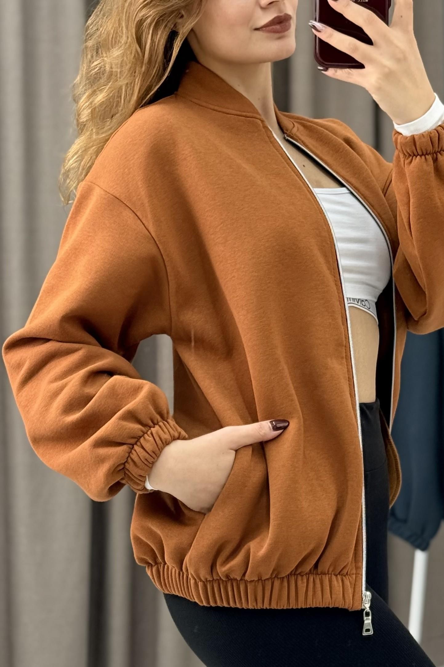 Üç İplik Şardonlu Kahverengi Beli Lastikli Fermuarlı Hırka (60002SWTXKHV)