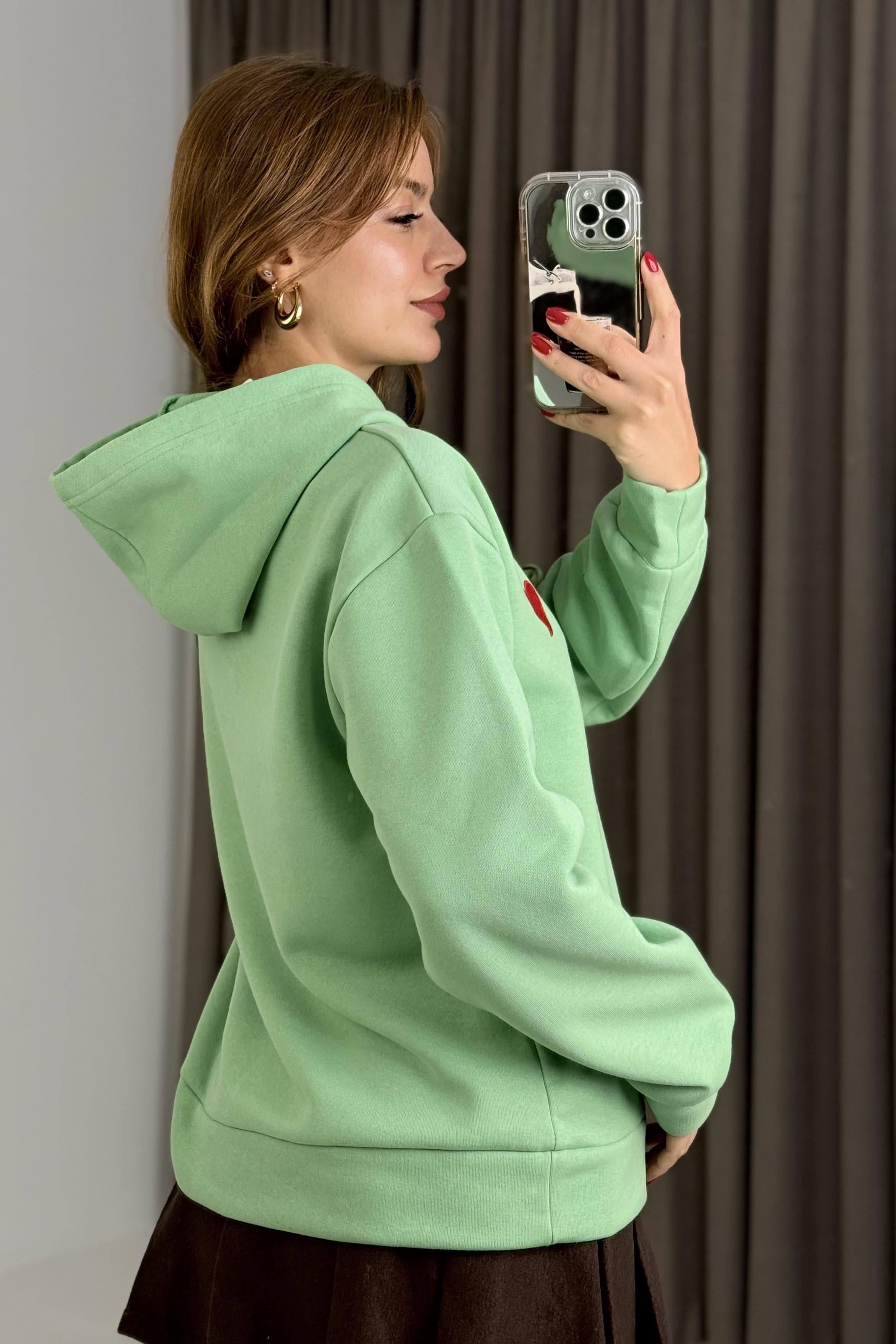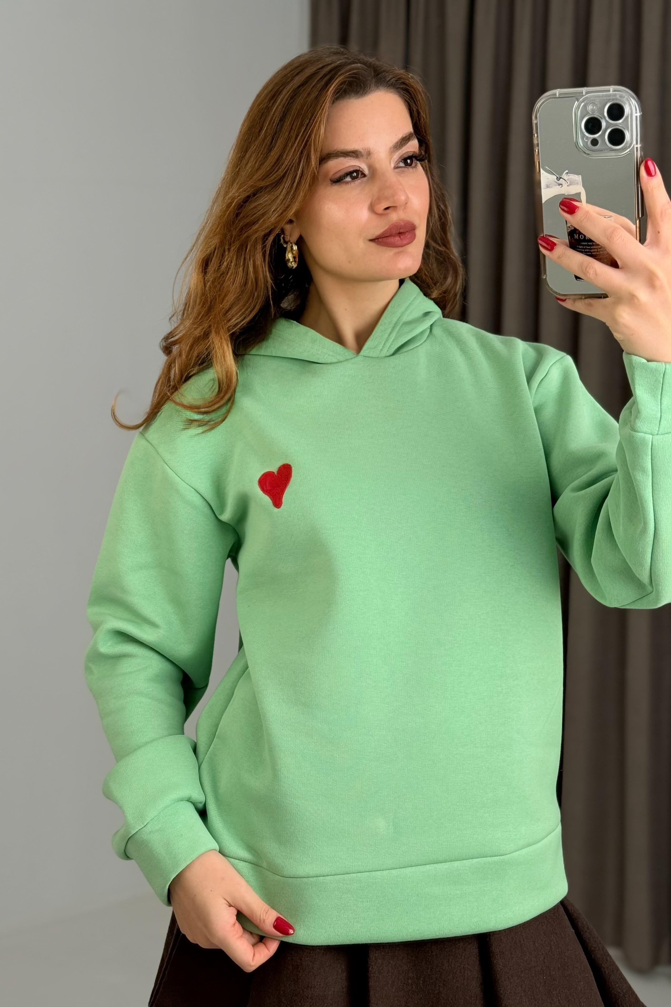 Üç İplik Su Yeşili Kalp Nakışlı Şardonlu Kangru Cepli Kapişonlu Sweat