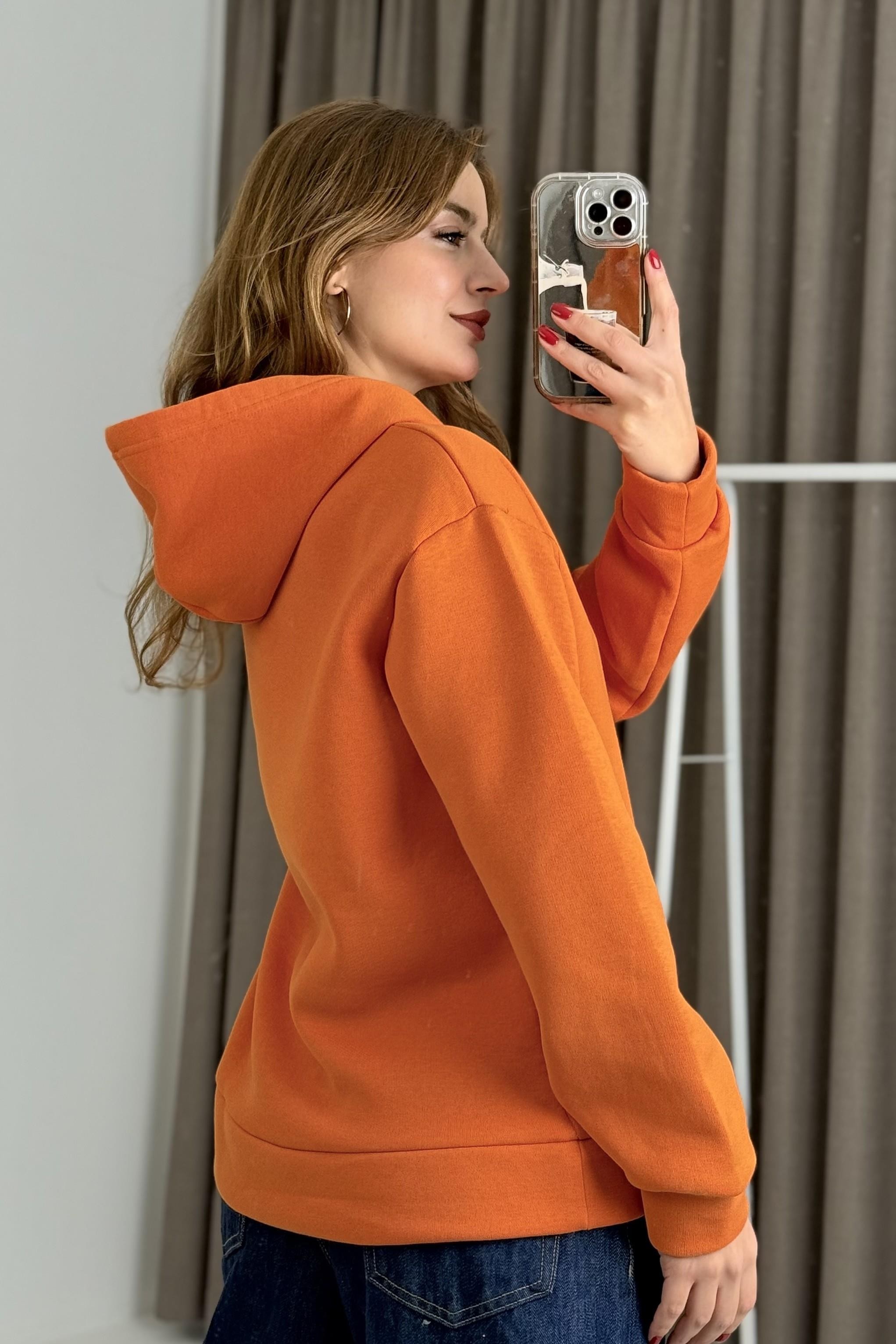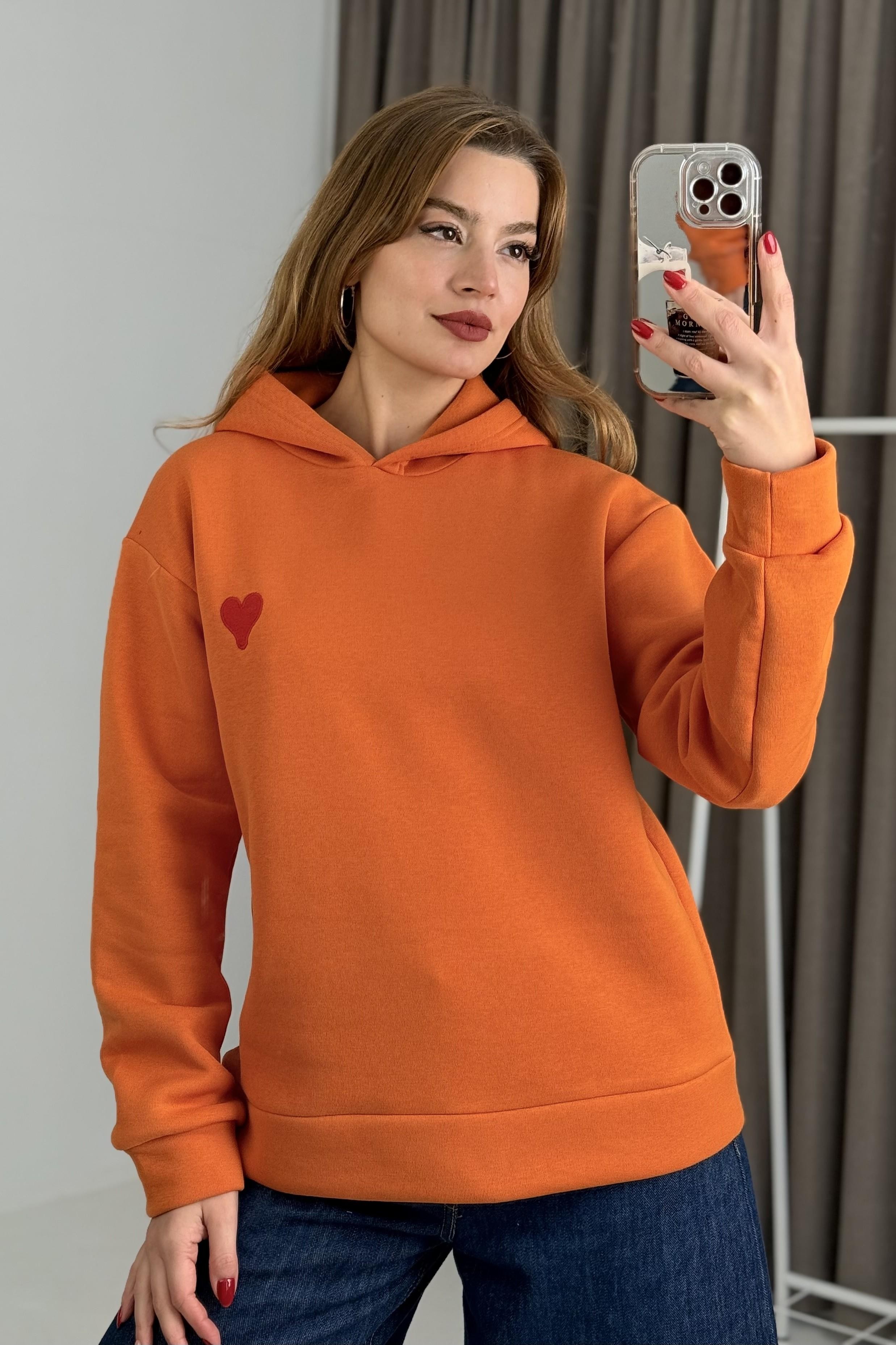 Üç İplik Turuncu Kalp Nakışlı Şardonlu Kangru Cepli Kapişonlu Sweat (600021SWTXTRN)
