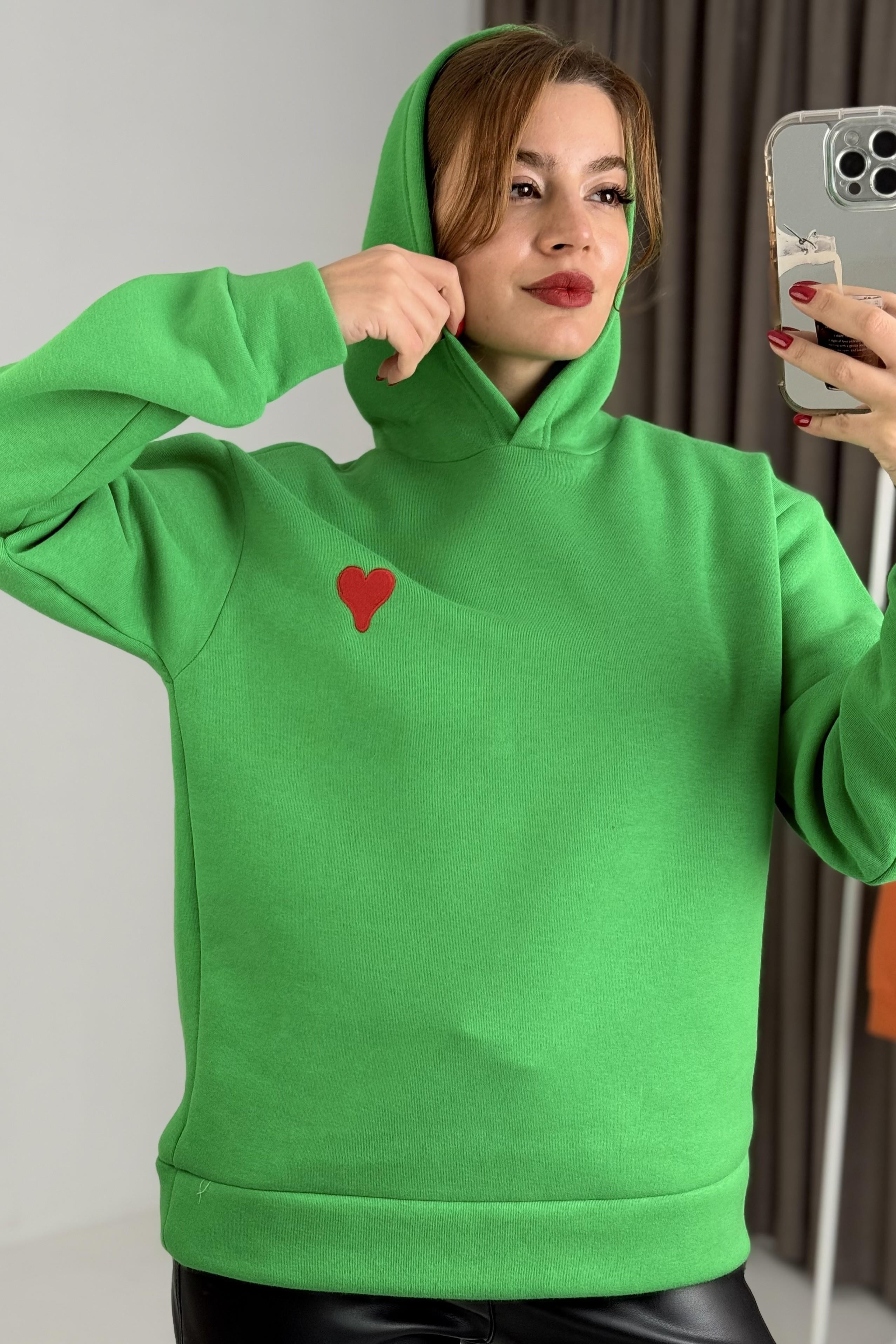 Üç İplik Yeşil Kalp Nakışlı Şardonlu Kapişonlu Sweat (600021SWTXYŞL)