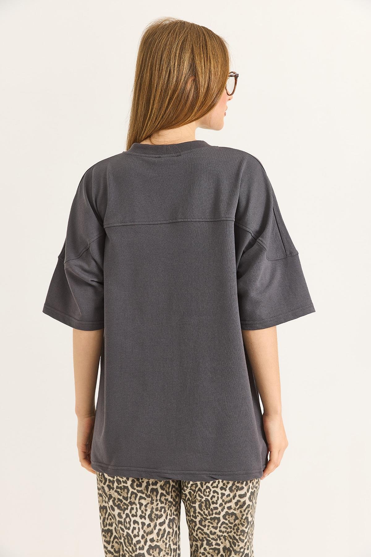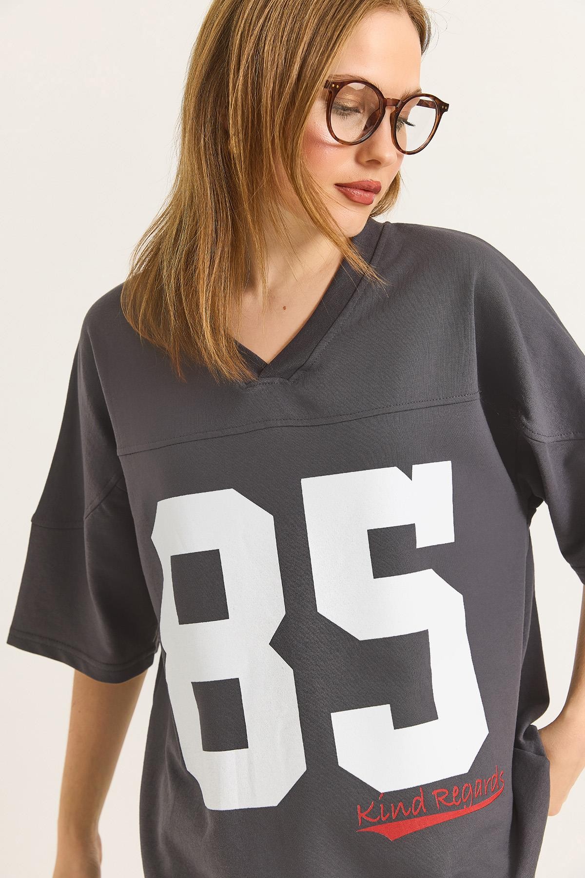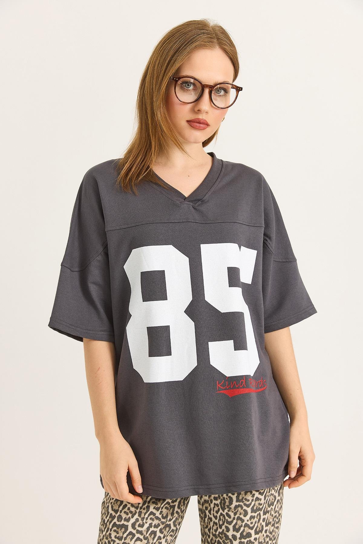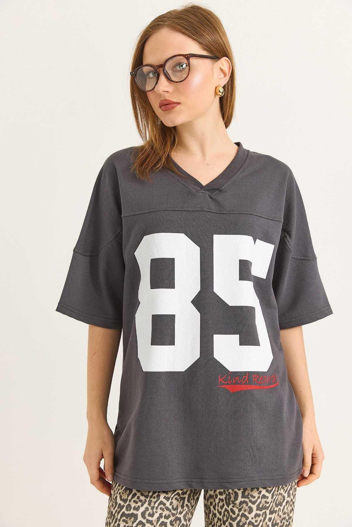V Yaka Baskı Detaylı Rahat Kalıp Tshirt  Füme