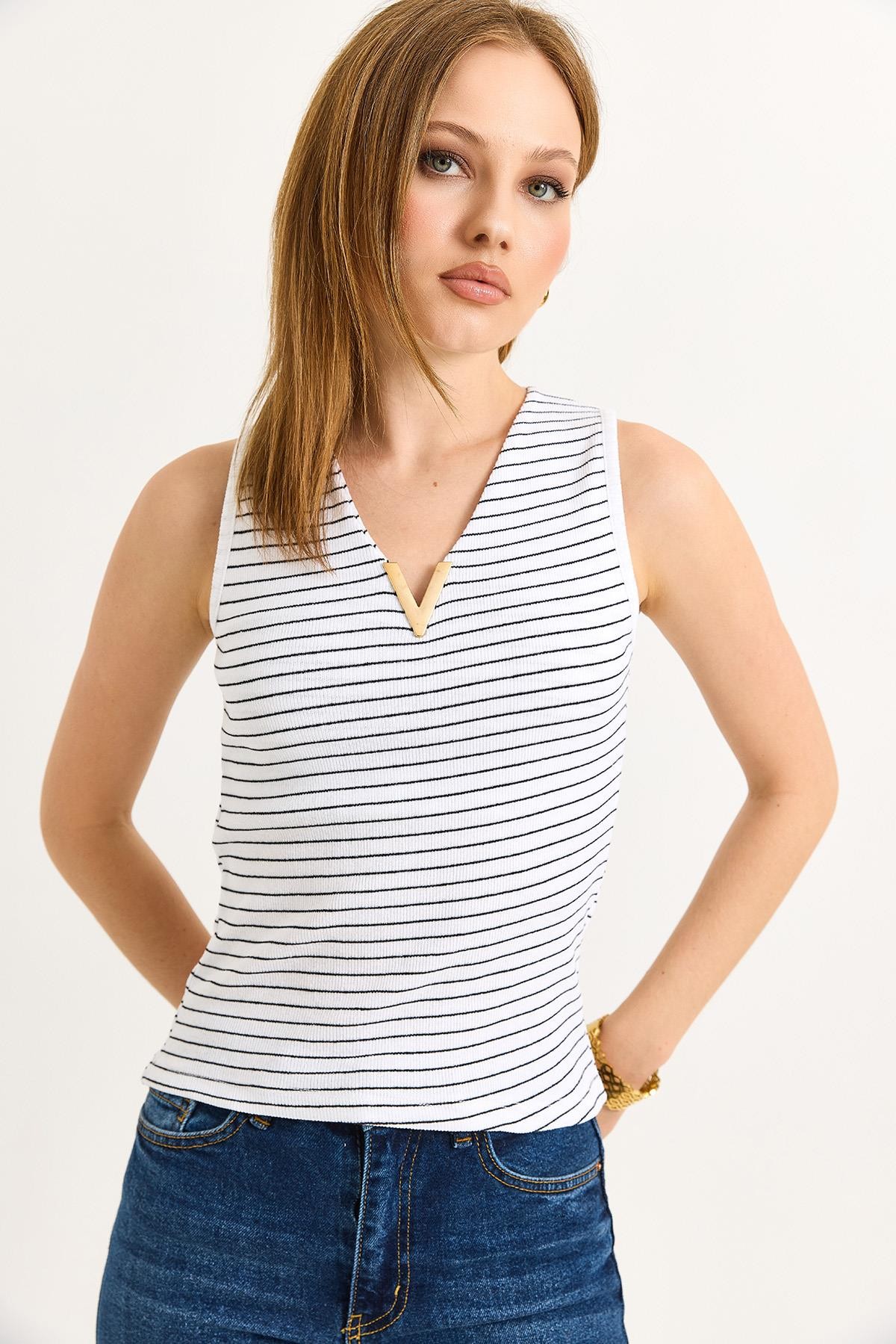 V Yaka Çizgi Desenli Bluz Beyaz (500183BLZXBYZ)