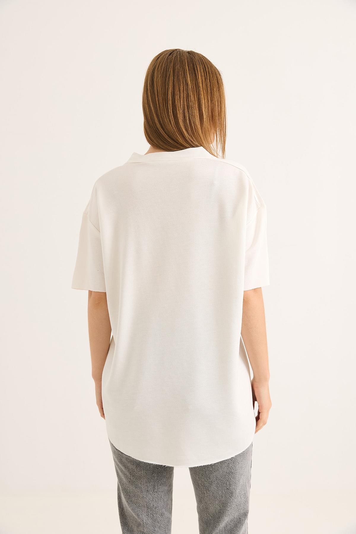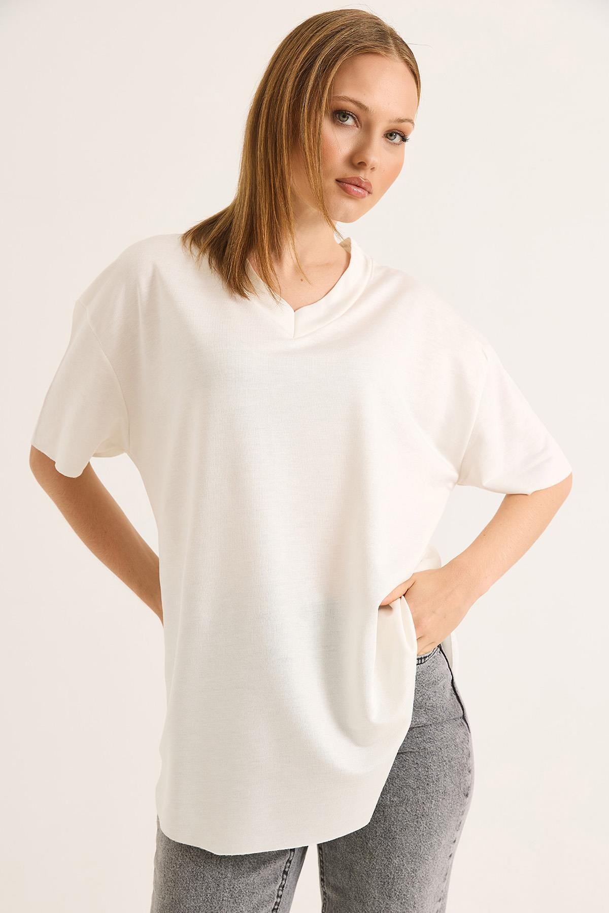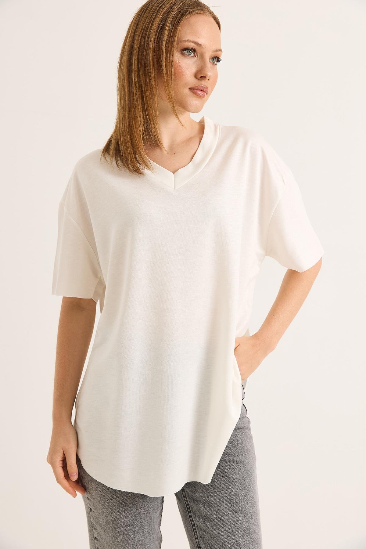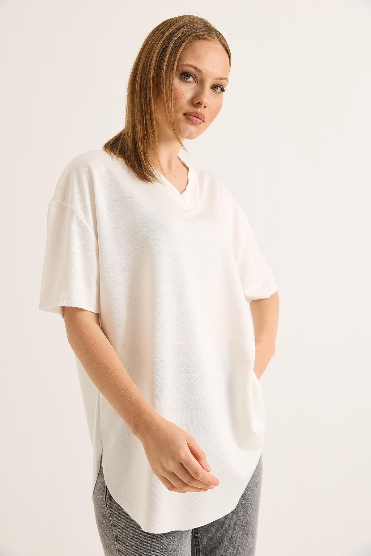 V Yaka Arkası Uzun Basic Tshirt Beyaz (250574TSHXBYZ)
