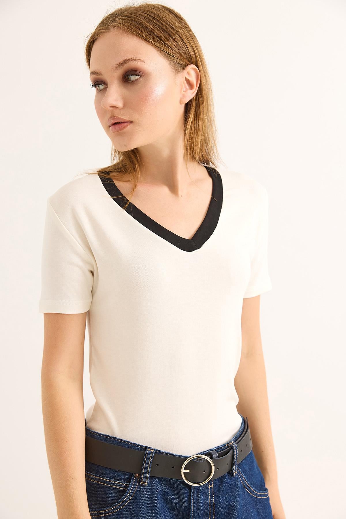V Yaka Kısa Kollu Kadın Kısa Tshirt Beyaz (251069TSHXBYZ)