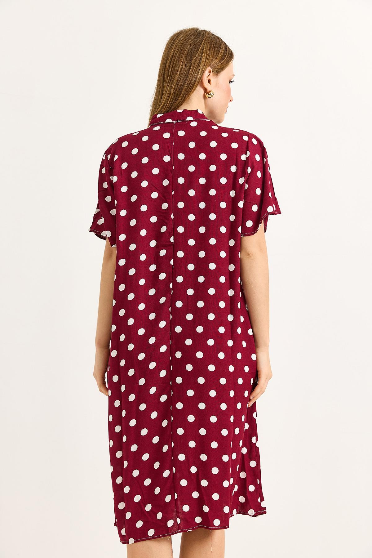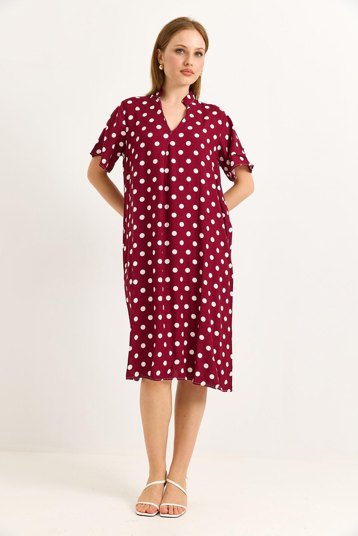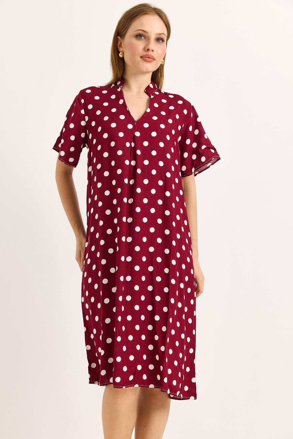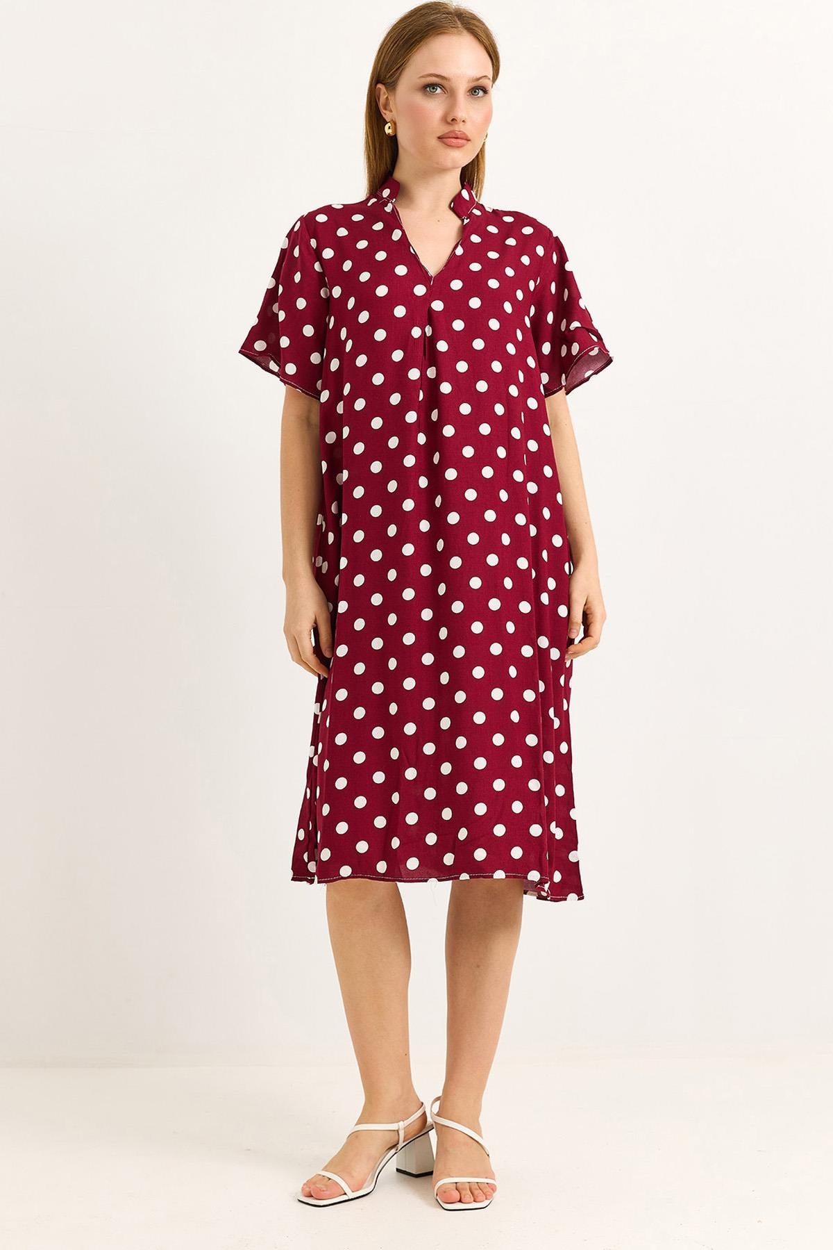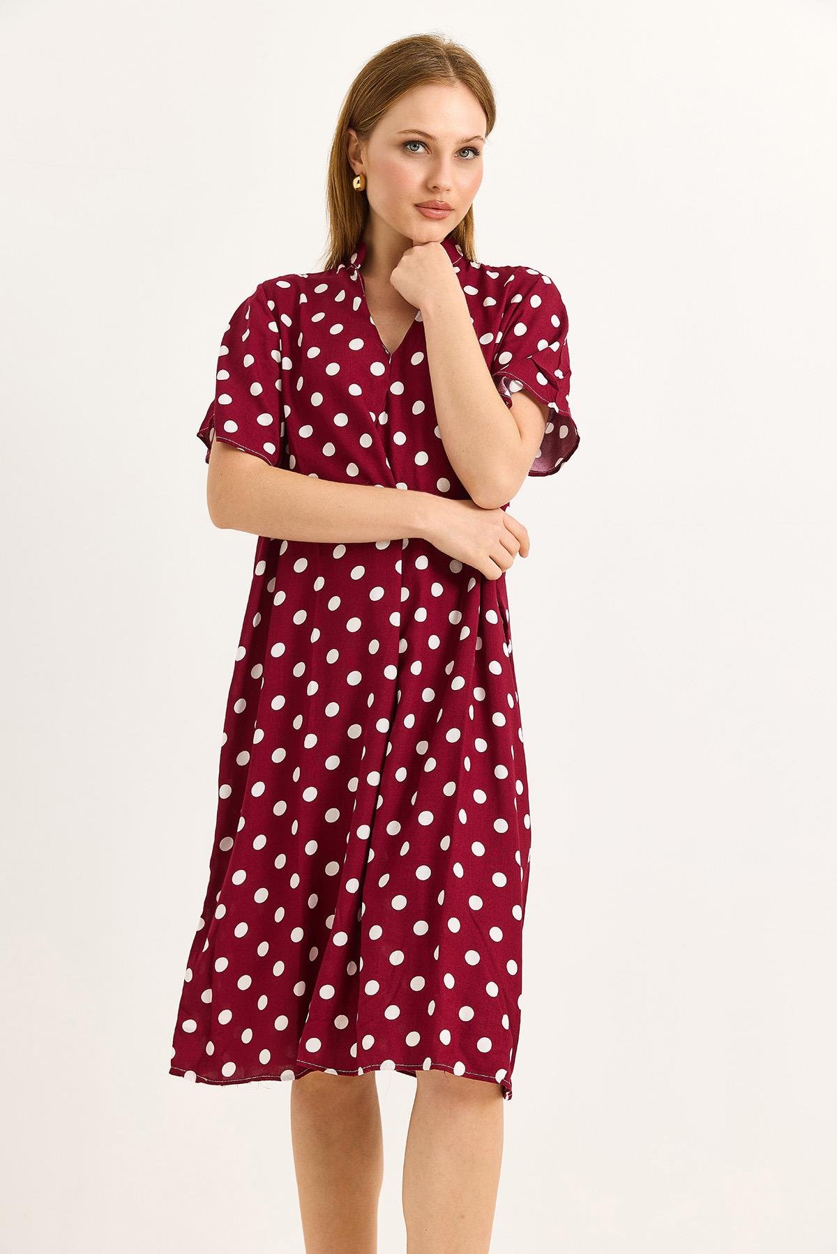 V Yaka Pile Detaylı Rahat Kalıp Dokuma Viskon Elbise Bordo (250851ELBXBRD)