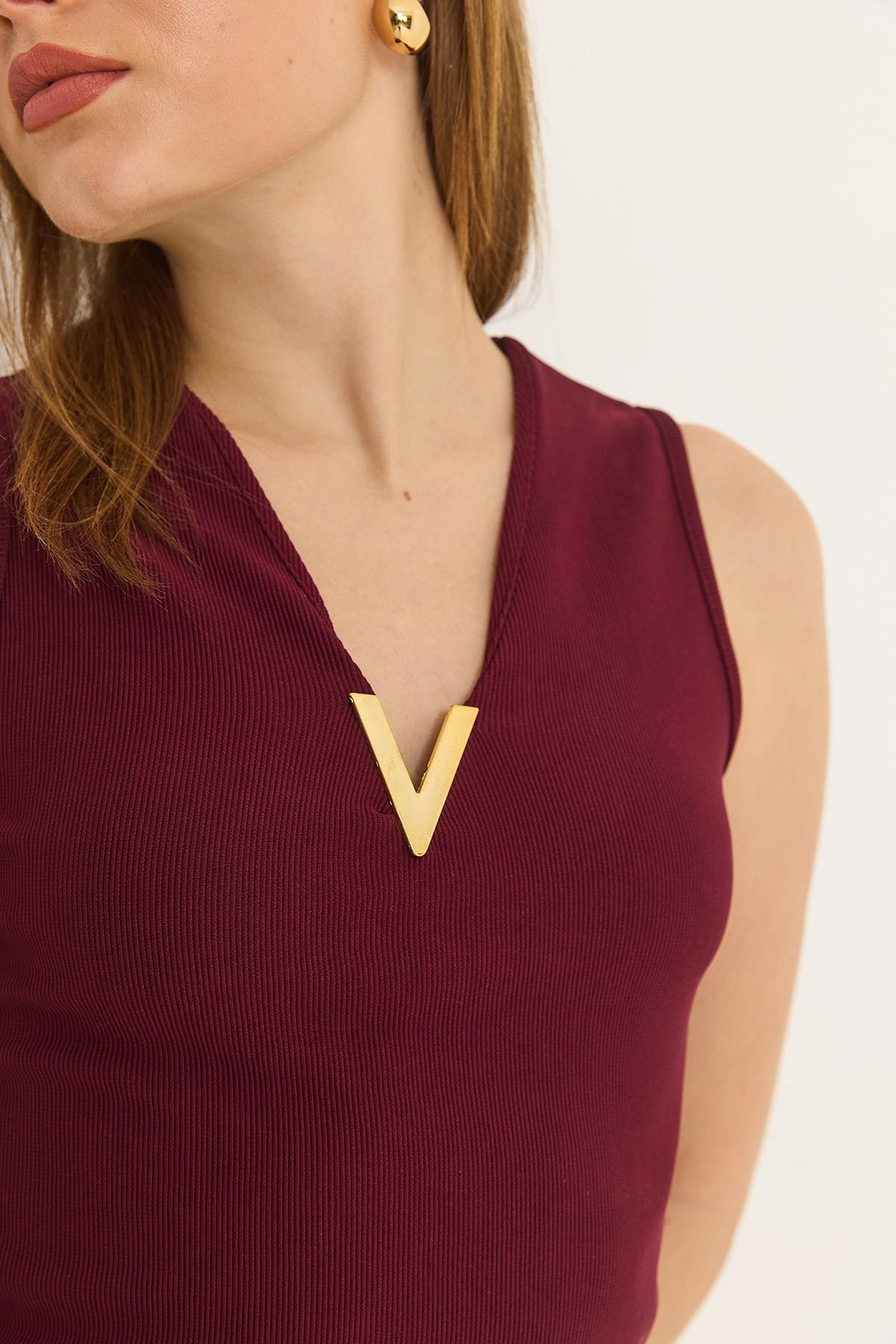 V Yaka Sıfır Kol Triko Bluz Bordo