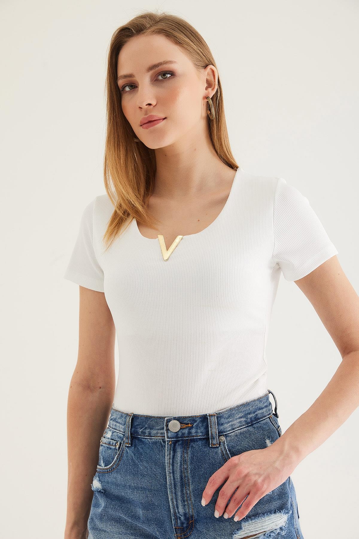 Yaka V Detay Kısa Kol Kaşkorse Bluz Beyaz (250454BLZXBYZ)