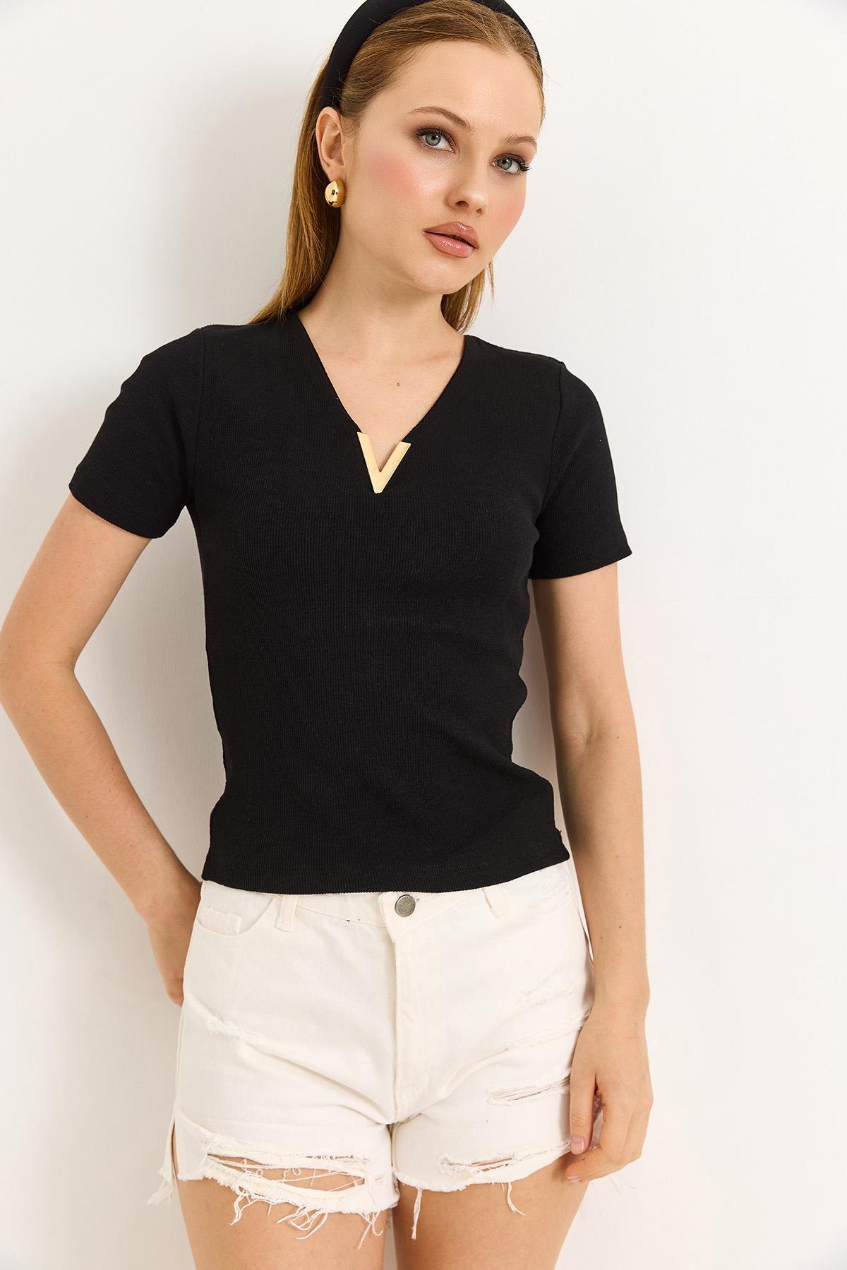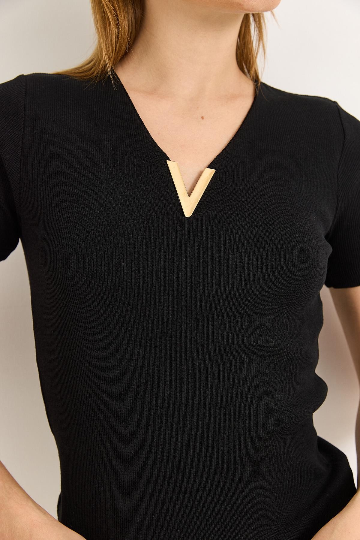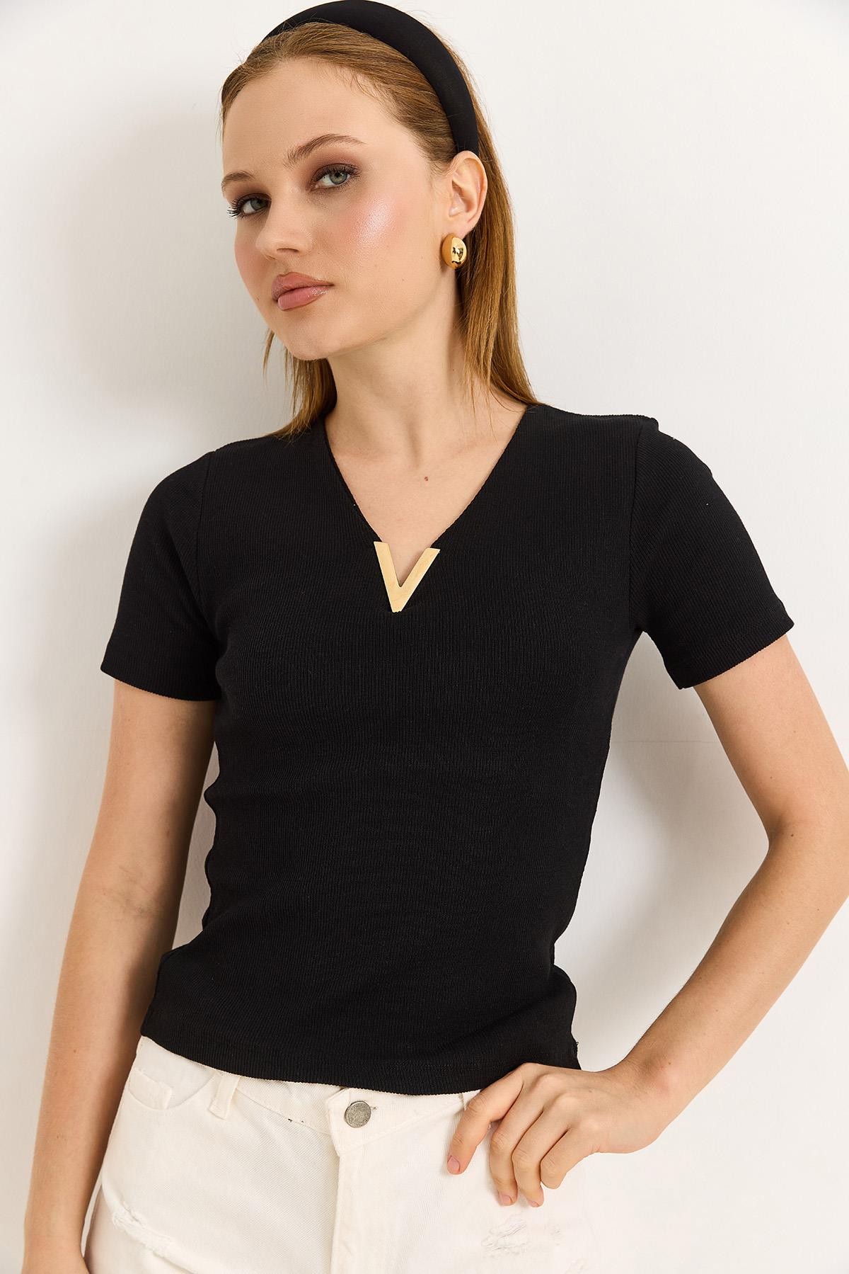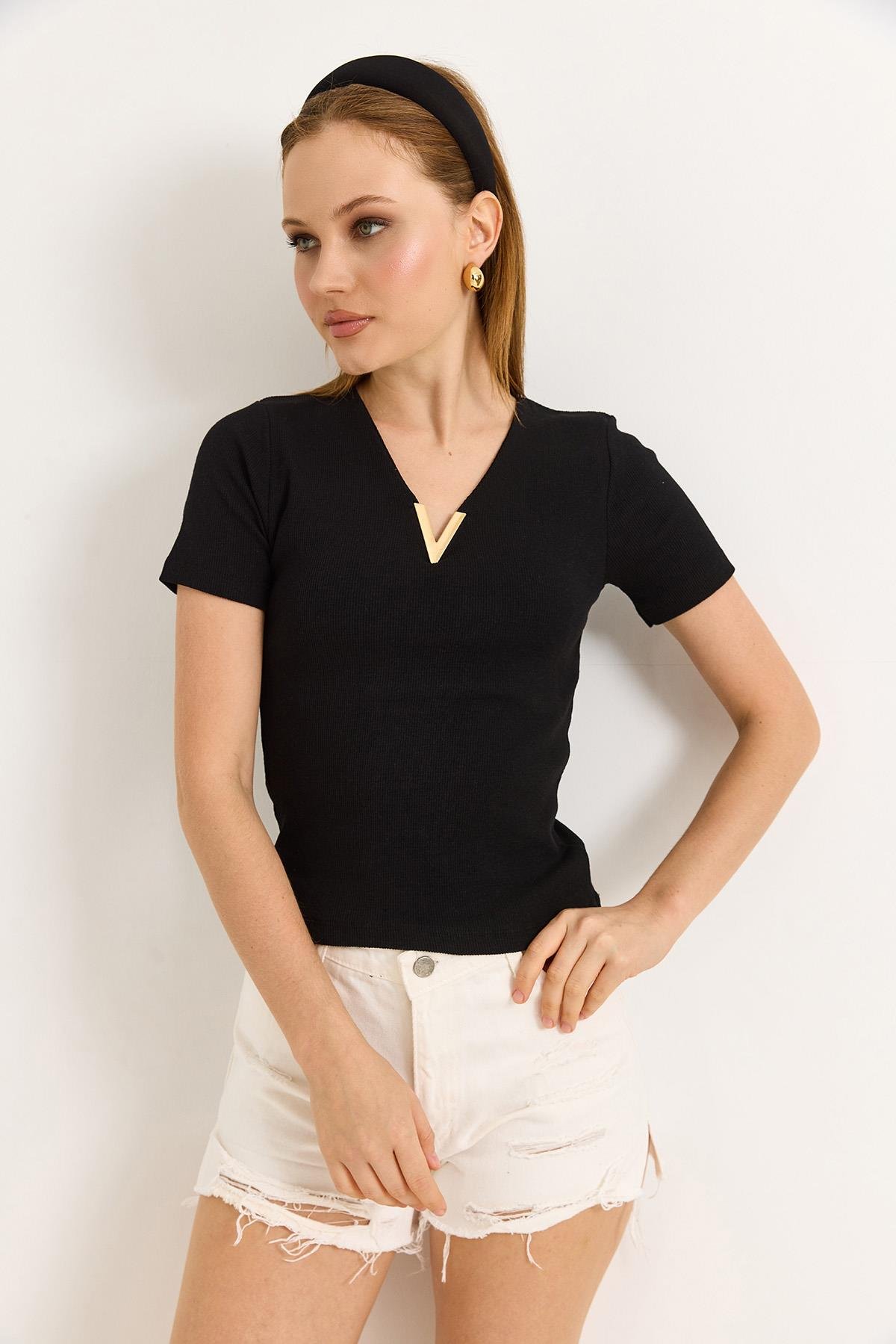 Yaka V detay Kısa Kol Kaşkorse Siyah (250454BLZXSYH)