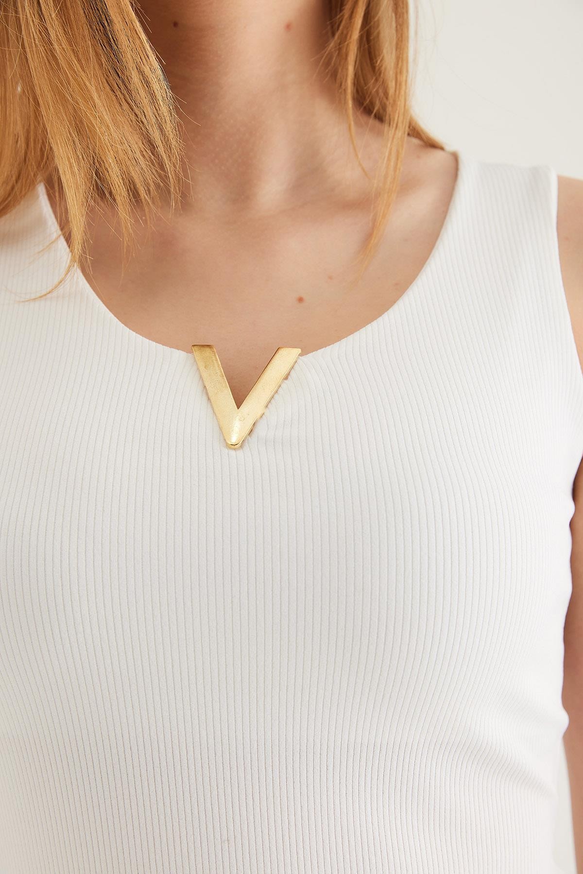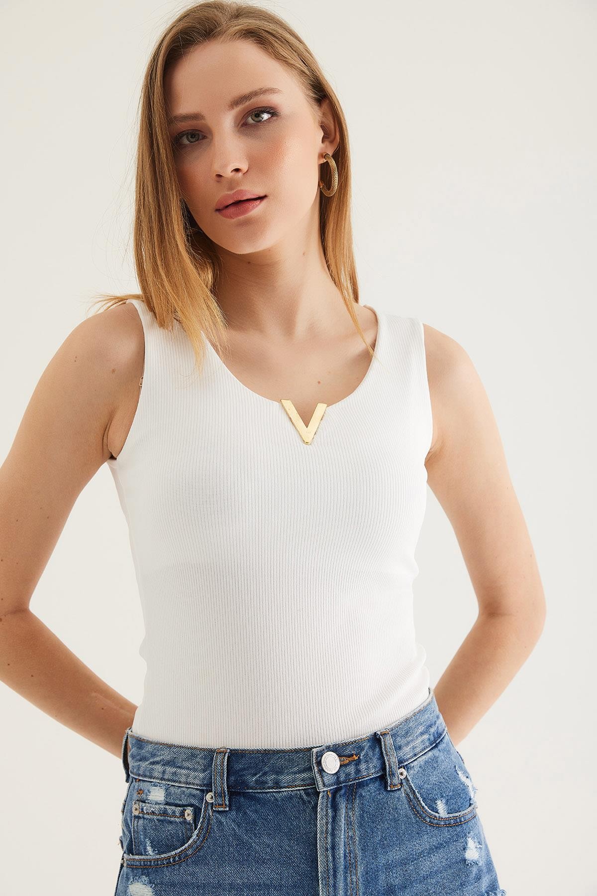 Yaka V Detay Triko Bluz Beyaz