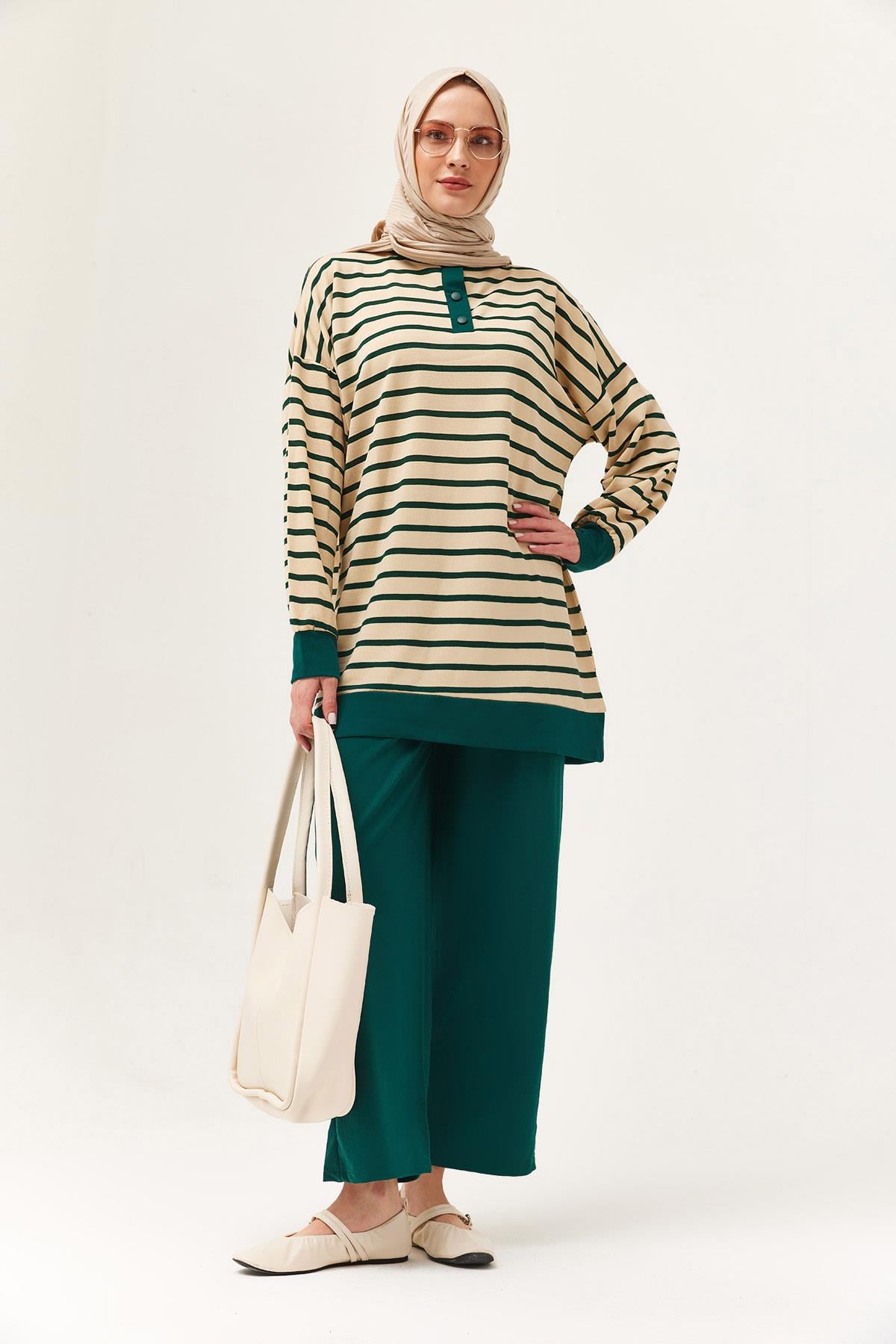 Yakası Düğmeli Çizgili İkili Takım Yeşil