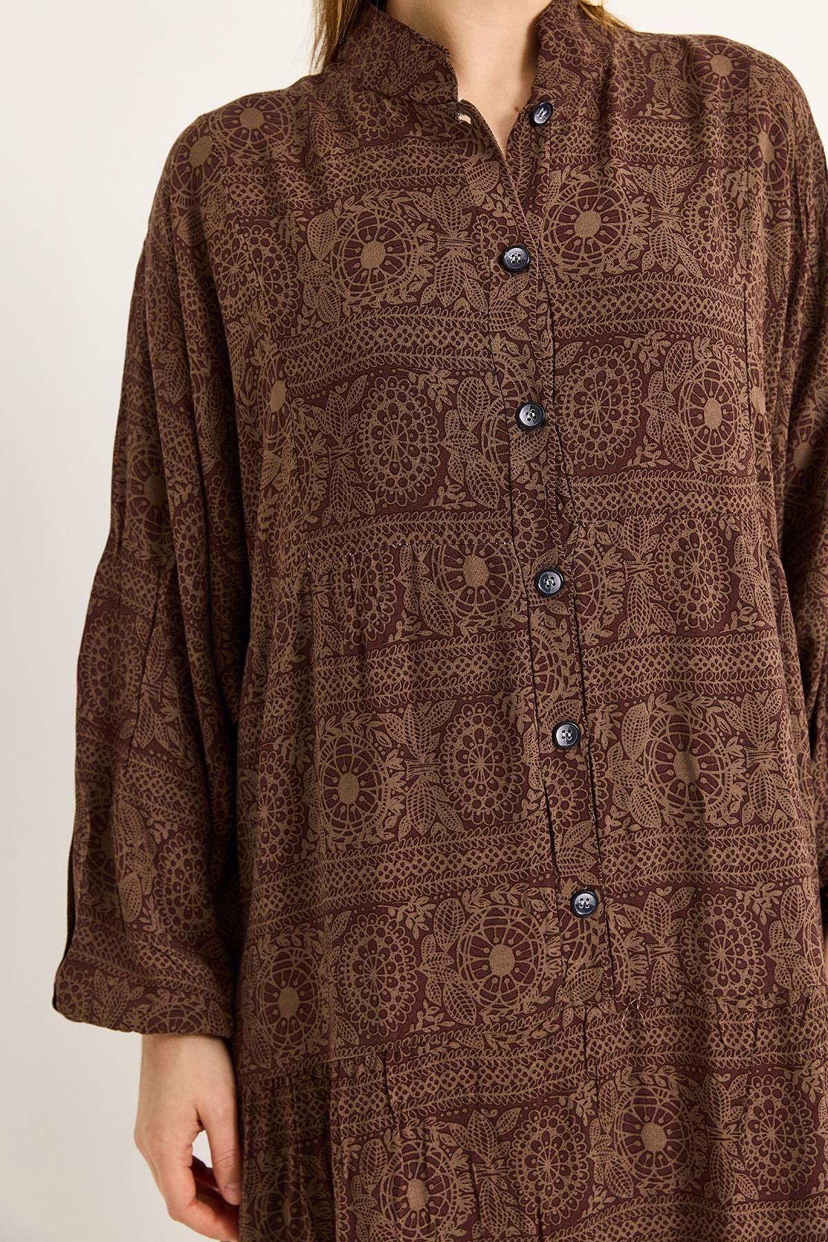 Yakası Düğmeli Viskon Etnik Desenli Rahat Elbise Kahverengi (500222ELBXKKHV)
