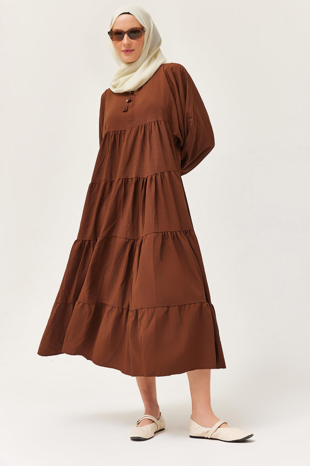 Yakası İpli Kat Model Elbise Kahverengi (250384ELBXKHV)