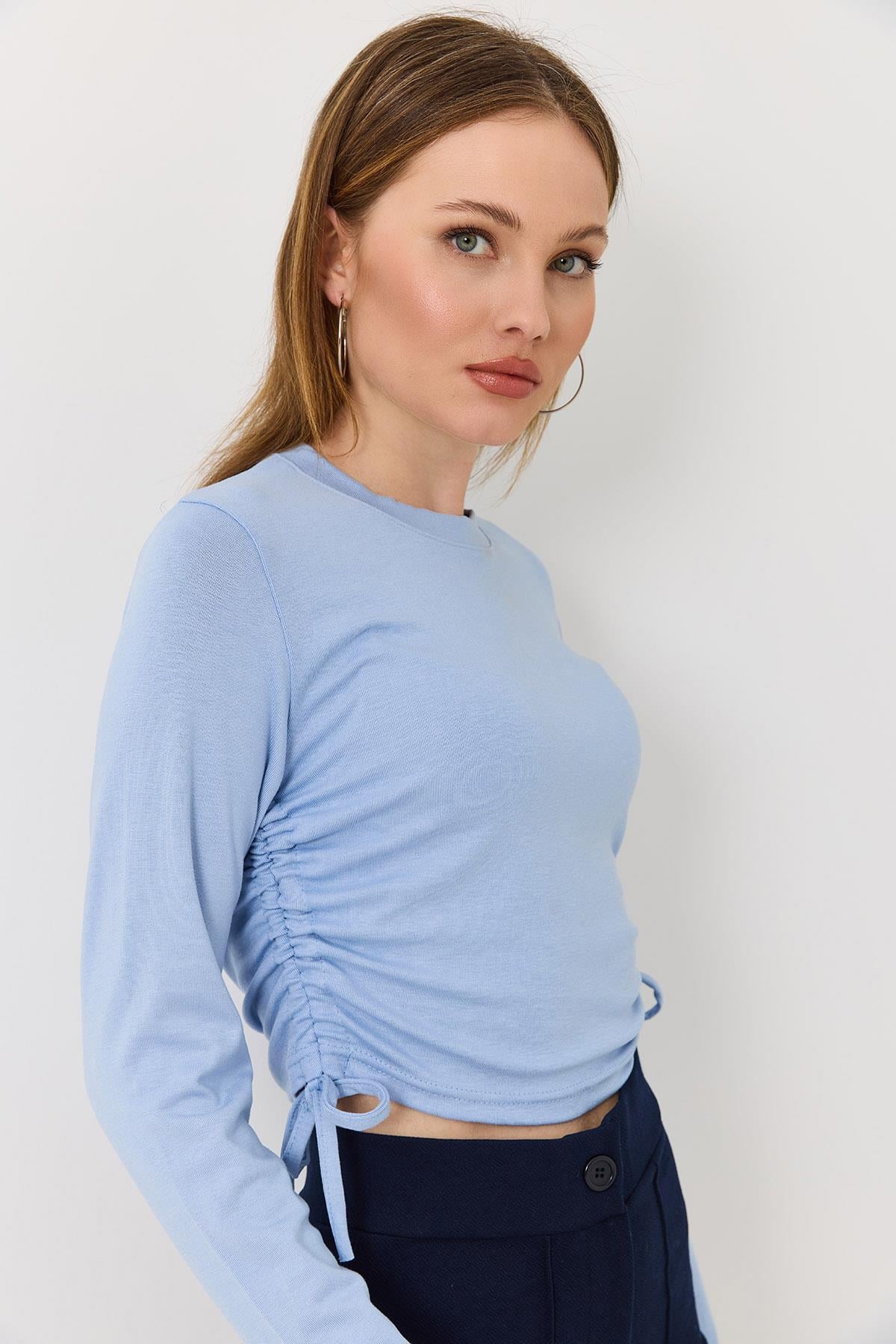 Yanları Büzgülü Uzun Kollu Mavi Bluz