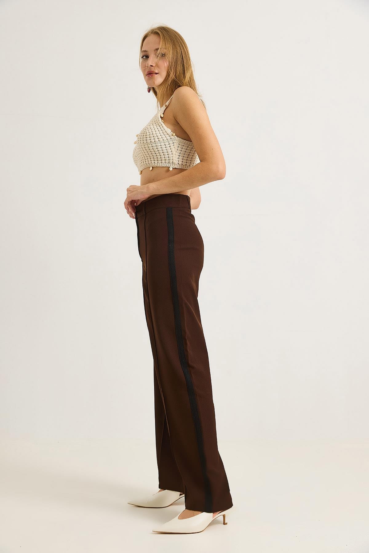 Yanları Şeritlik Bol Paça Kadın Pantolon Kahverengi (500500PNTXKHV)