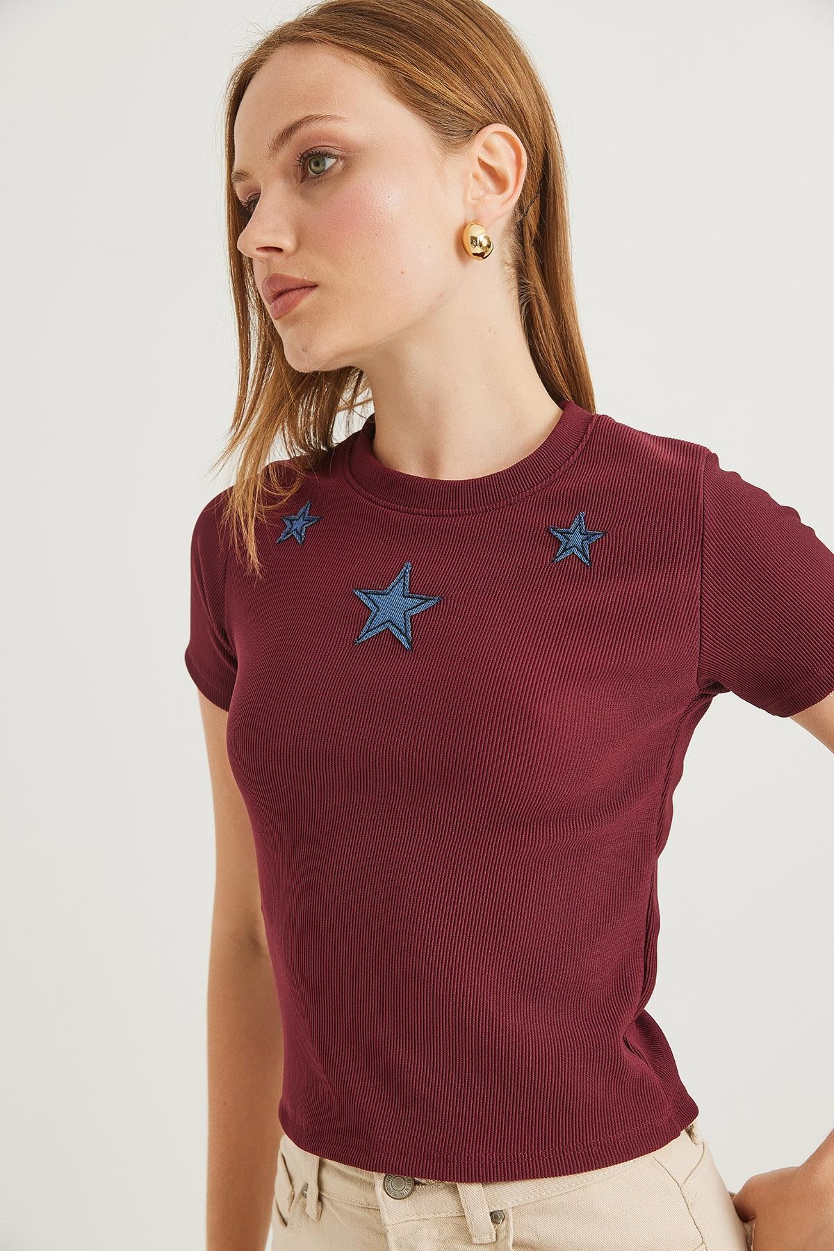 Yıldız Detaylı Fitilli Kısa Kollu Crop Bluz Bordo (250692BLZXBRD)