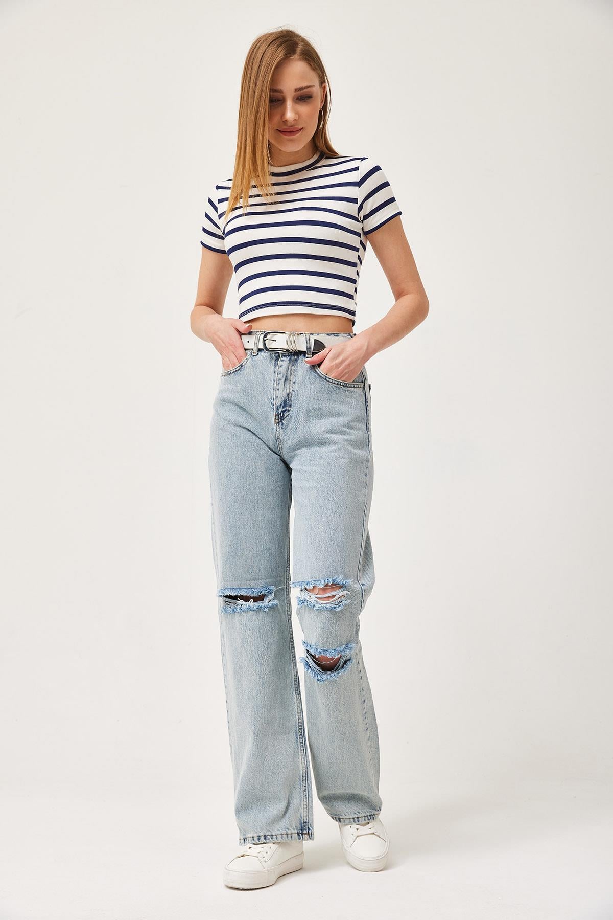 Yüksek Bel Bol Kesim Yırtık Detay Jean Mavi