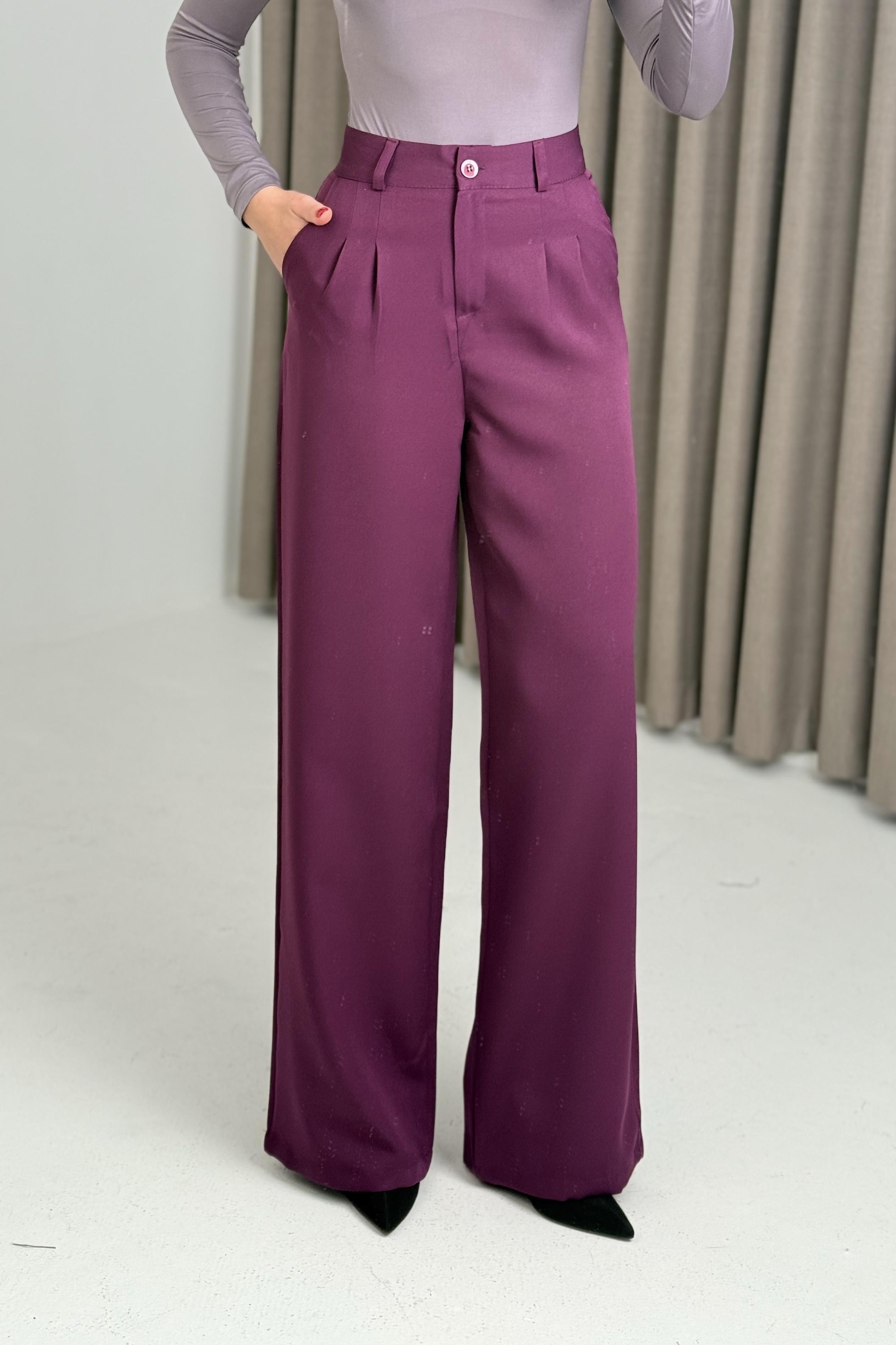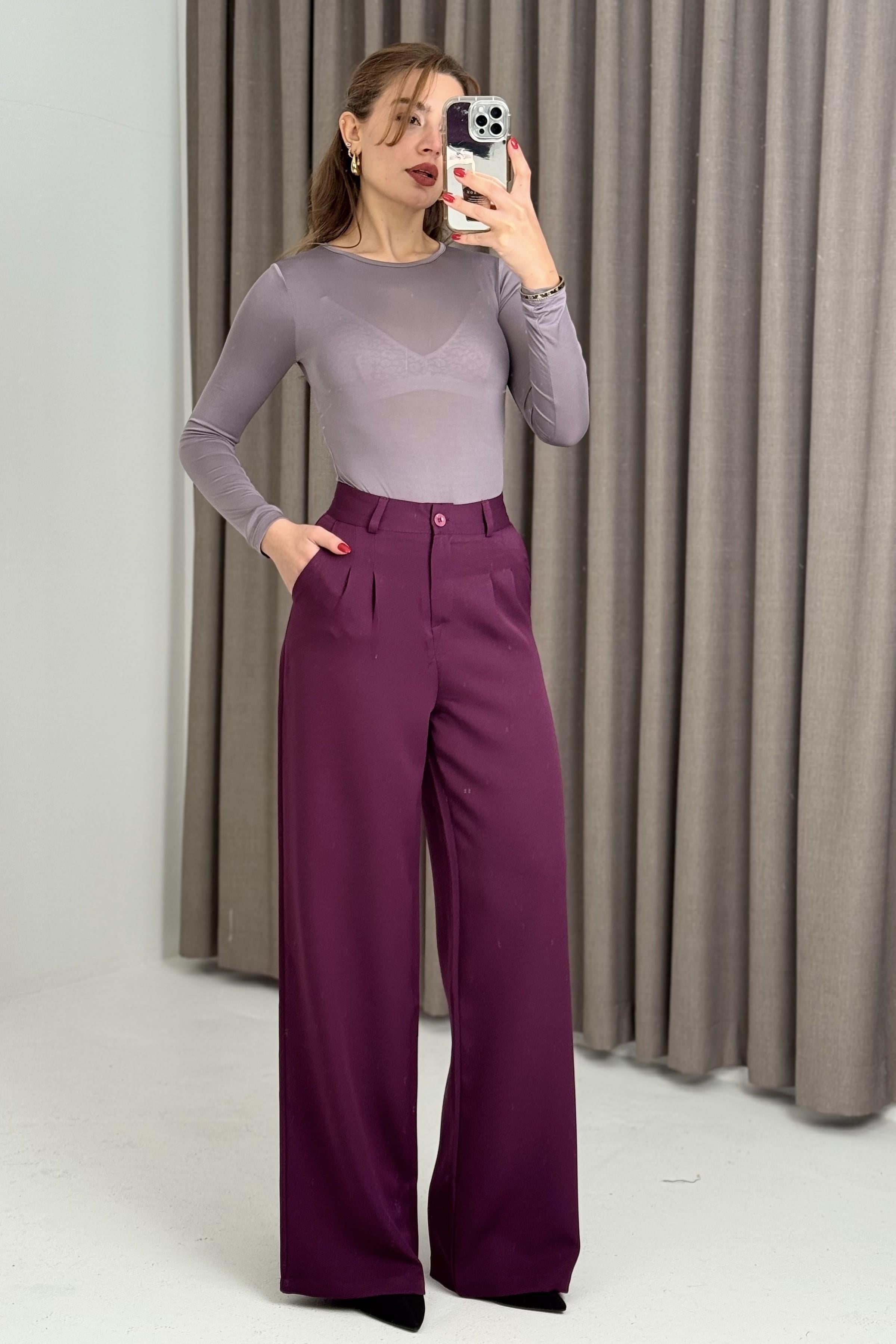 Yüksek Bel Bol Paça Kumaş Pantalon Mor