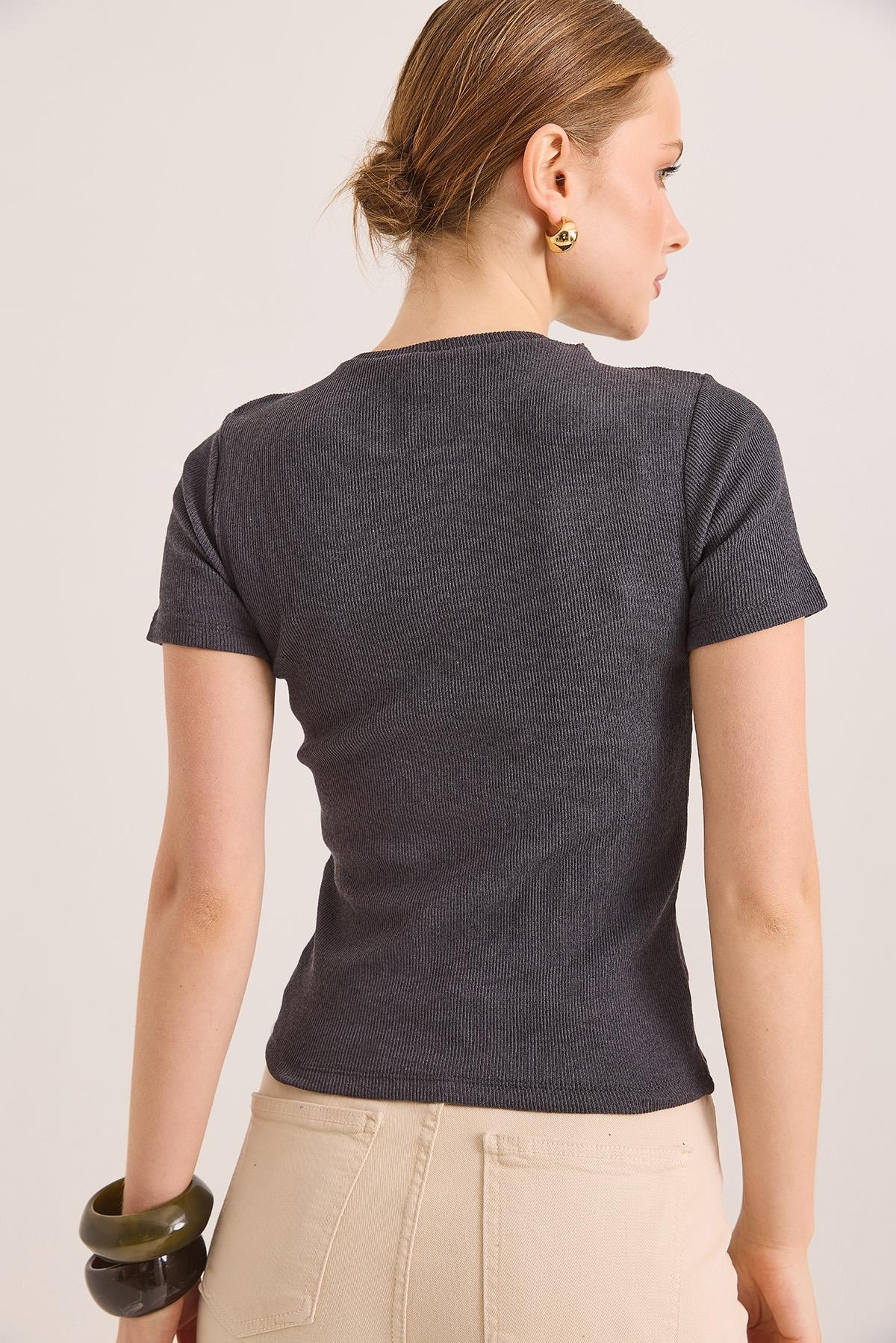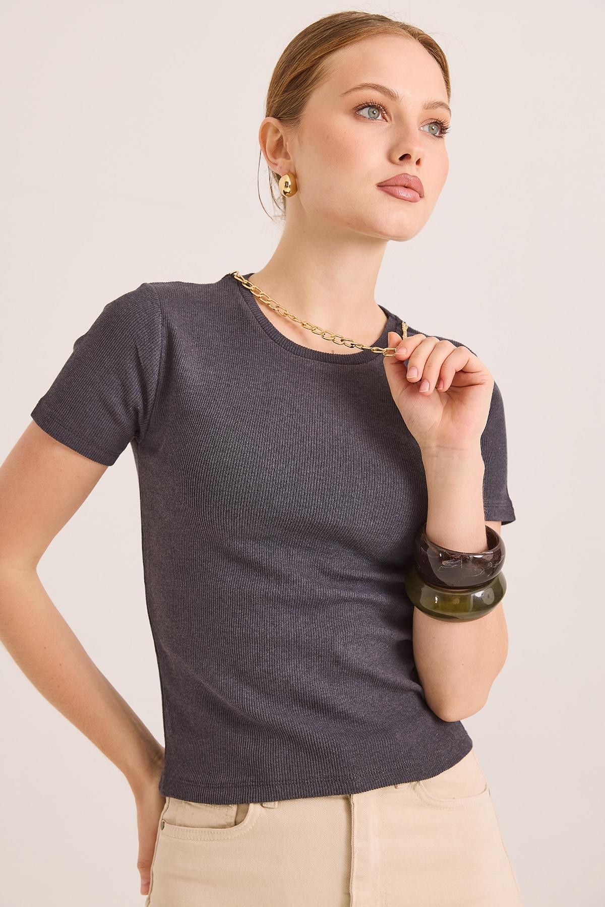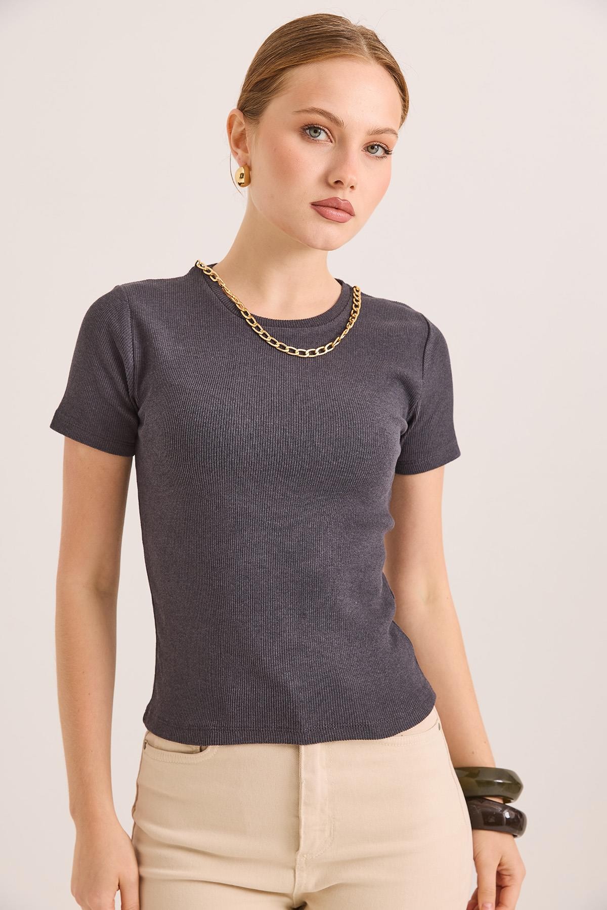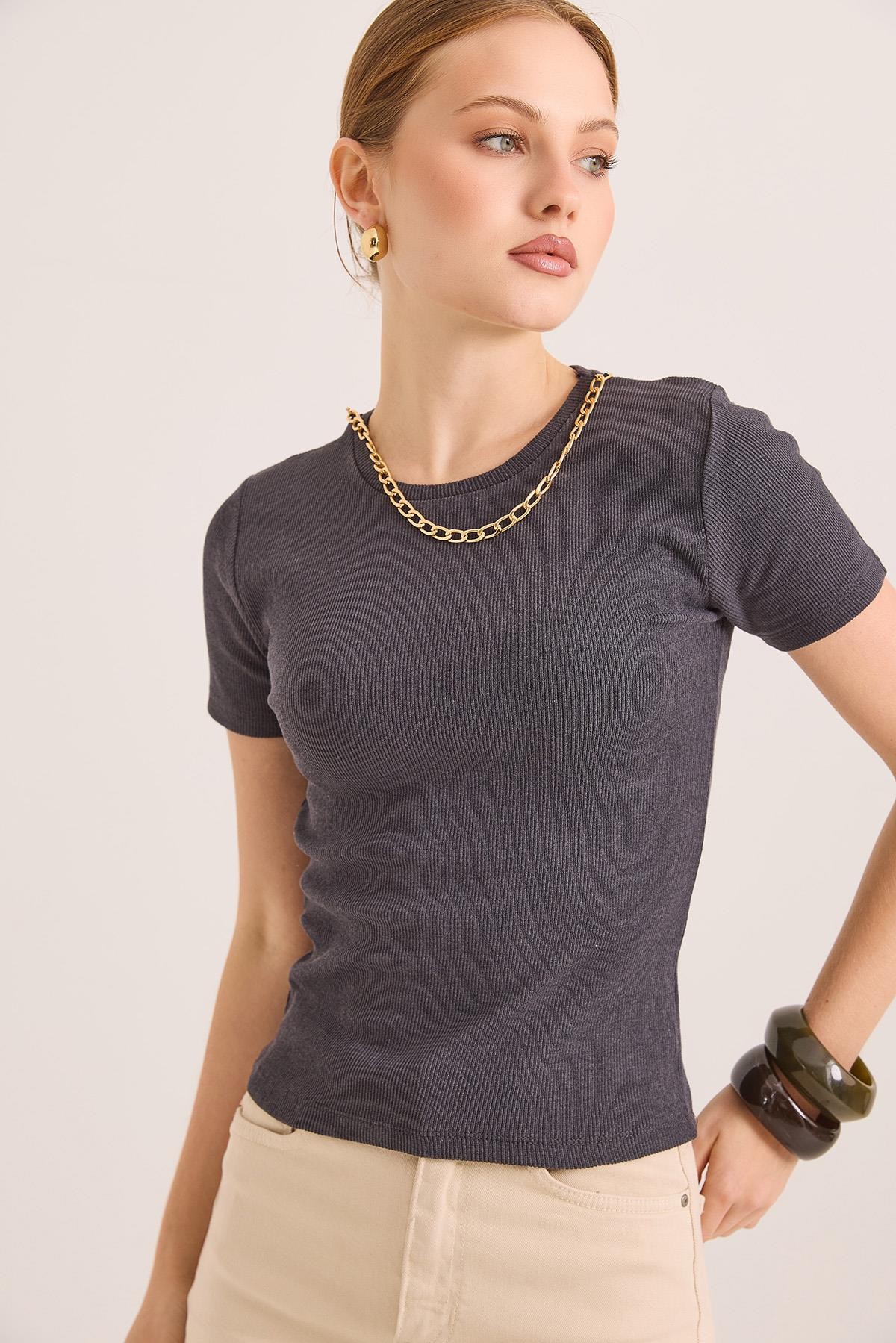 Yuvarlak Yaka Zincir Detaylı Örme Kaşkorse Bluz Füme (250737BLZXFME)